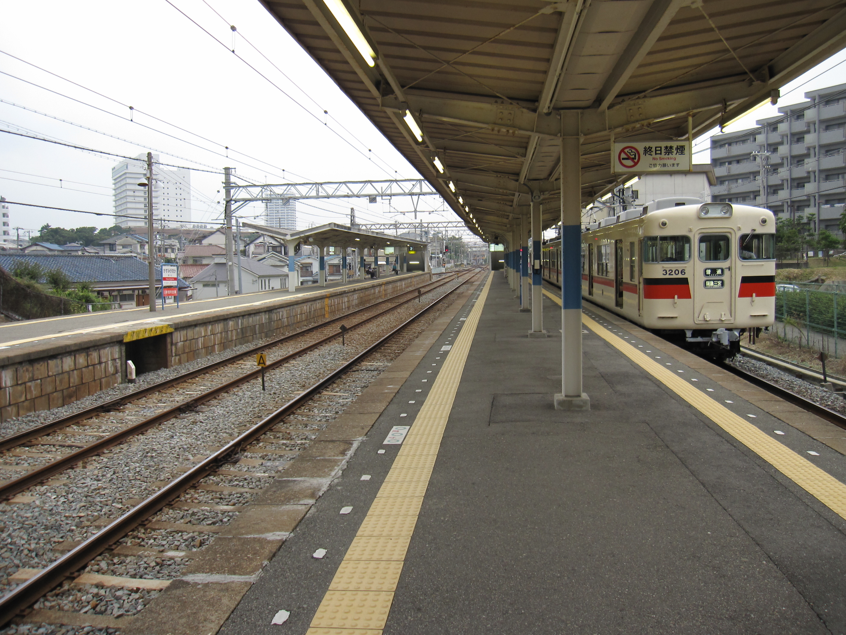 - 1917년 4월 12일: 효고 전기궤도 '''우타시키야마역'''(歌敷山駅, うたしきやまえき일본어)이 시오야(현 산요시오야역) ~ 아카시(초대) 구간 연장 시에 영업 개시. 이 역은 현재의 가스미가오카 역에서 서쪽으로 약 300m 거리에 있었다.[2][3]