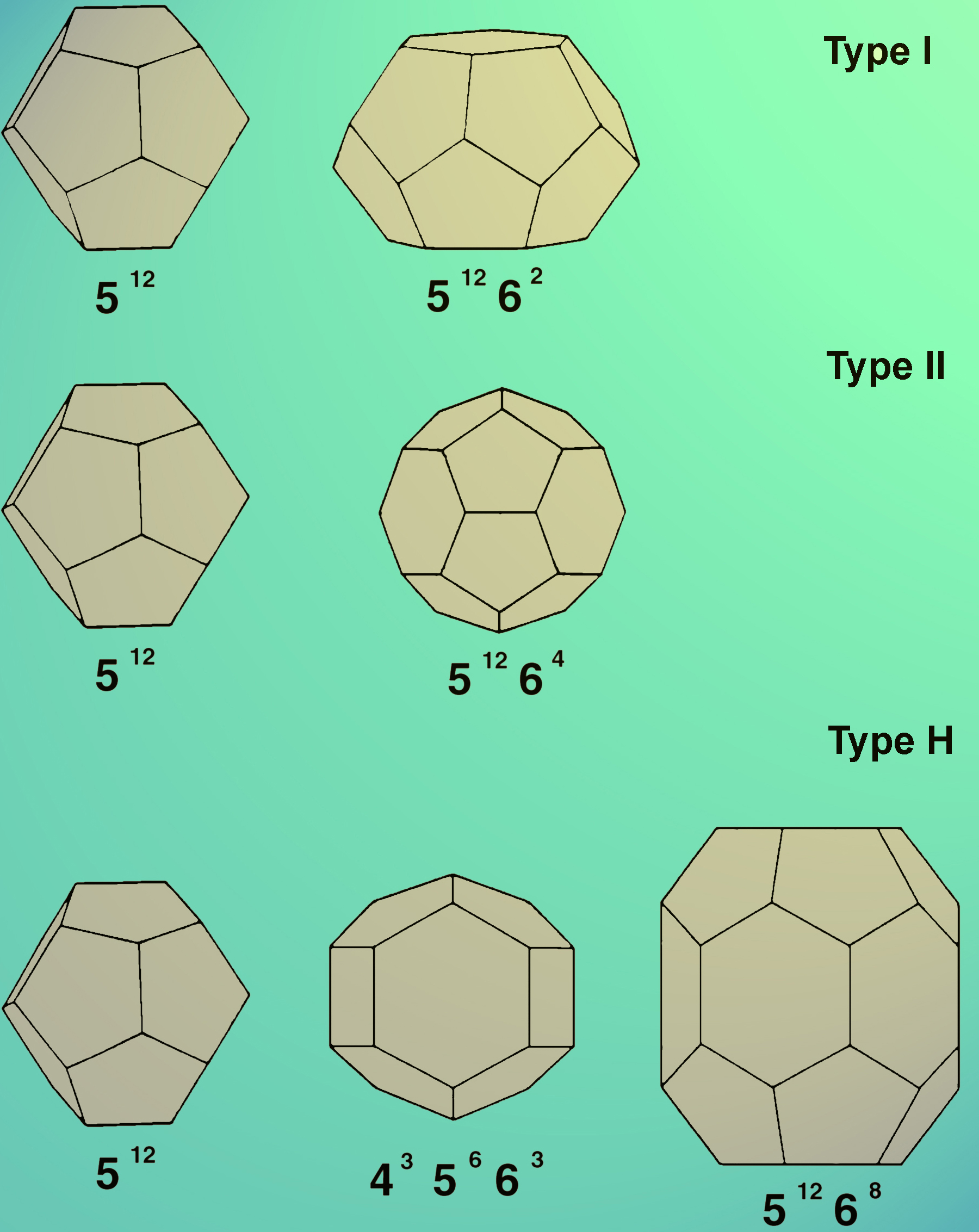 가스 하이드레이트는 일반적으로 두 가지 결정학적 입방 구조를 형성하는데, 공간군이 인 구조 I (sI이라고 명명)와 공간군이 인 구조 II (sII이라고 명명)가 있다.[18]