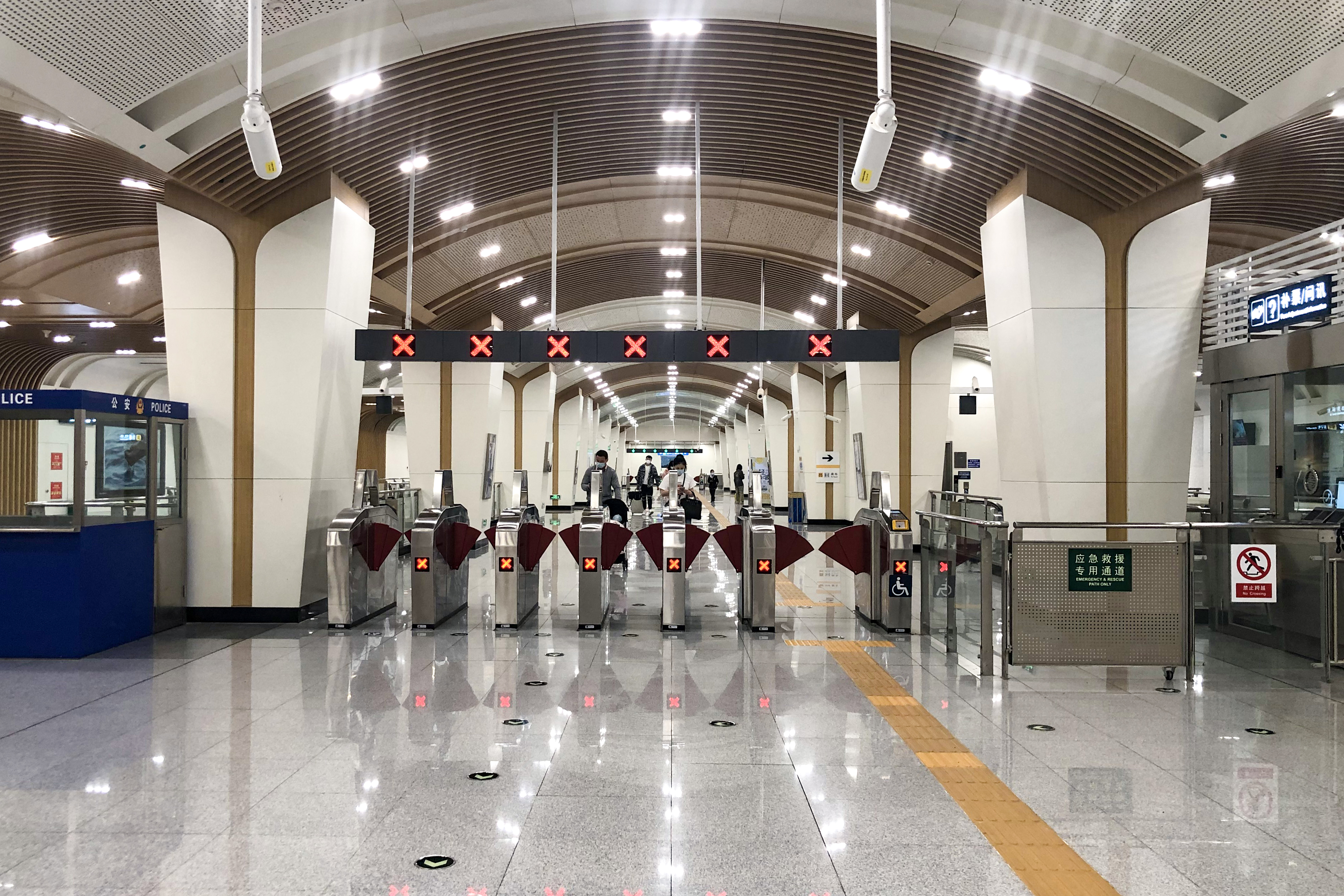 승강장← 7호선 베이징 서역 방면 (췬팡) 섬식 승강장, 왼쪽 / 오른쪽 출입문이 열림 7호선 유치 전용 승강장 섬식 승강장, 왼쪽 / 오른쪽 출입문이 열림 → 7호선 유니버설리조트 방면 (화좡)