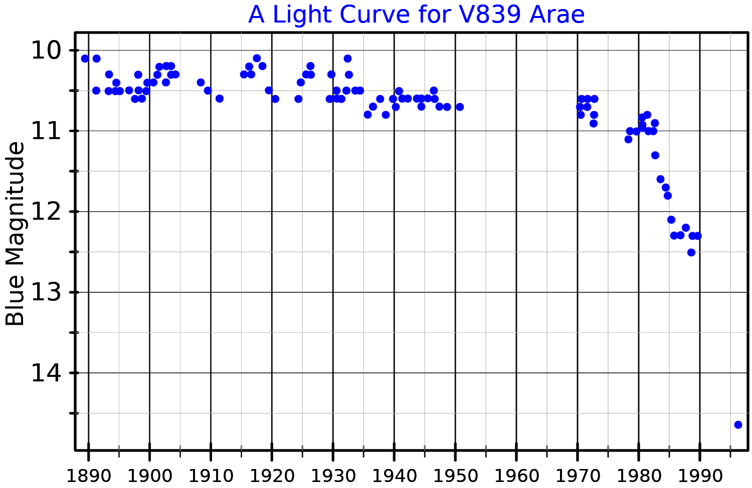 1993년, M. Parthasarathy 외 연구진은 중심별의 밝기에 대한 측정 기록을 검토하여, 이것이 스펙트럼의 가시광선 영역에서 어두워지고 있다는 결론을 내렸다. 1997년에는 변광성 명칭 V839 Arae로 지정되었다.