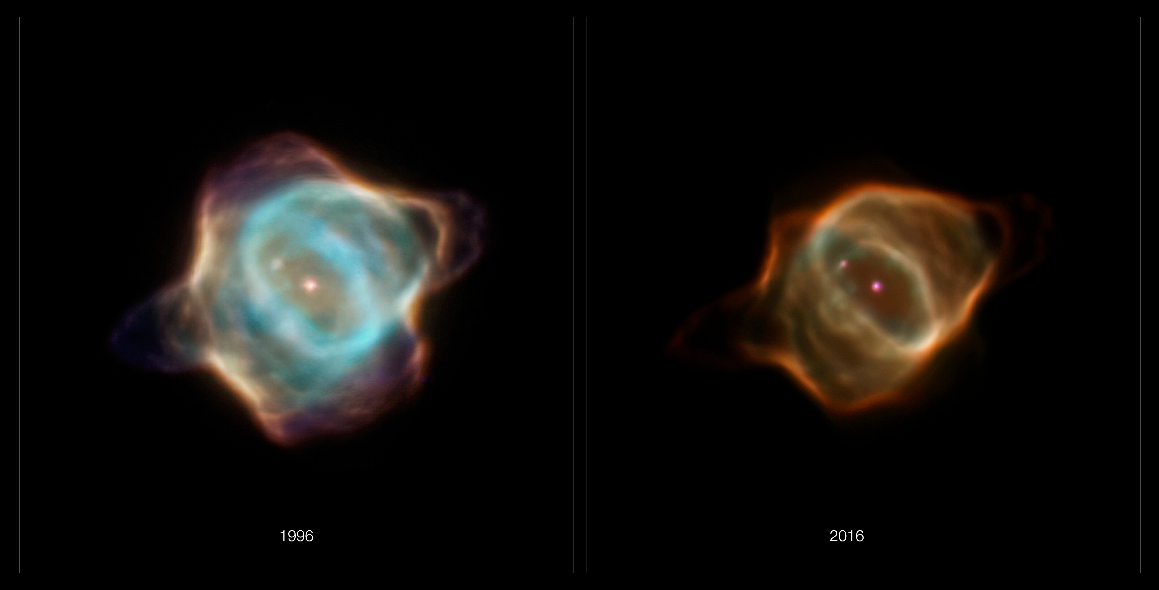 2021년 1월, NASA는 성운이 1990년대에 최고 밝기에 도달한 이후 어두워지고 있다는 것을 발견했다.[7] 이전에 광이온화되었던 성운의 양이온은 전자와 재결합하고 있다.[8] 안달루시아 천체물리 연구소(Instituto de Astrofísica de Andalucía)의 연구원 마틴 A. 게레로(Martín A. Guerrero)는 "이것은 매우, 매우 극적이고, 매우 이상합니다. 우리는 성운의 진화를 실시간으로 목격하고 있습니다. 수년에 걸쳐 성운의 변화를 볼 수 있습니다. 우리는 이런 시야로 얻을 수 있는 명확성으로 이런 현상을 이전에 본 적이 없습니다."라고 말했다.[9]