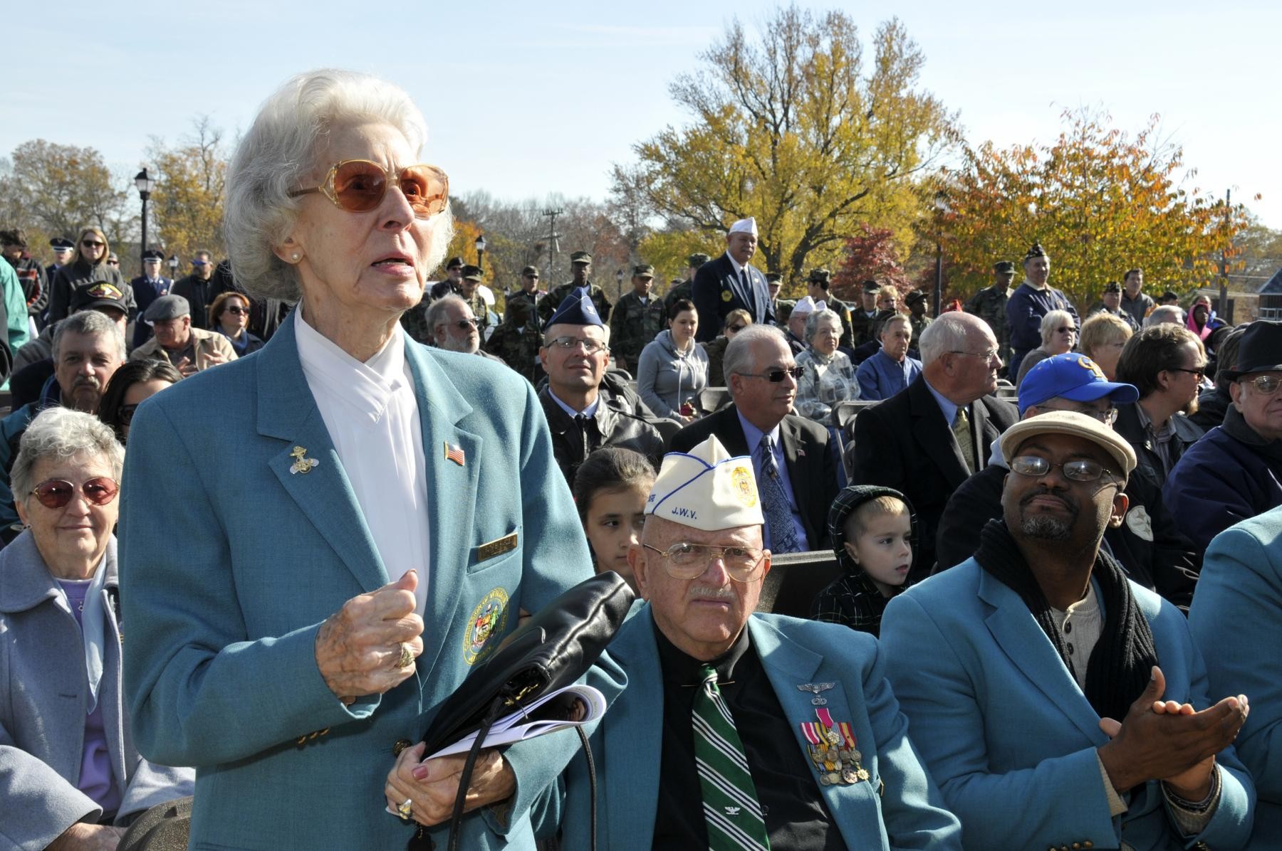 미 해군 참전용사 루스 하든이 2013년 11월 9일 델라웨어주 의사당에서 열린 제2차 세계 대전 기념관 헌정식에서 "Anchors Aweigh"가 연주되는 동안 노래를 부르고 있다.