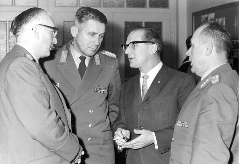 제2차 세계 대전 중 독일 저항 운동에 참여했던 공산주의자이자 동독 지도자인 에리히 호네커가 NVA 장군 발터 알렌슈타인, 하인츠 호프만, 쿠르트 바그너와 함께 있는 모습이다. 에리히 호네커는 붉은 전선 투쟁 동맹의 무장 투쟁가였고, 하인츠 호프만은 스페인 내전의 국제 여단 참전 용사였으며, 쿠르트 바그너는 발트하임 감옥의 정치범이었다.