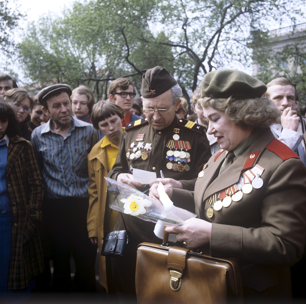 붉은 군대 참전 용사 우마르 부르카노프와 타티야나 디덴코가 1979년 전승절에 모스크바에서 주소를 교환하는 모습