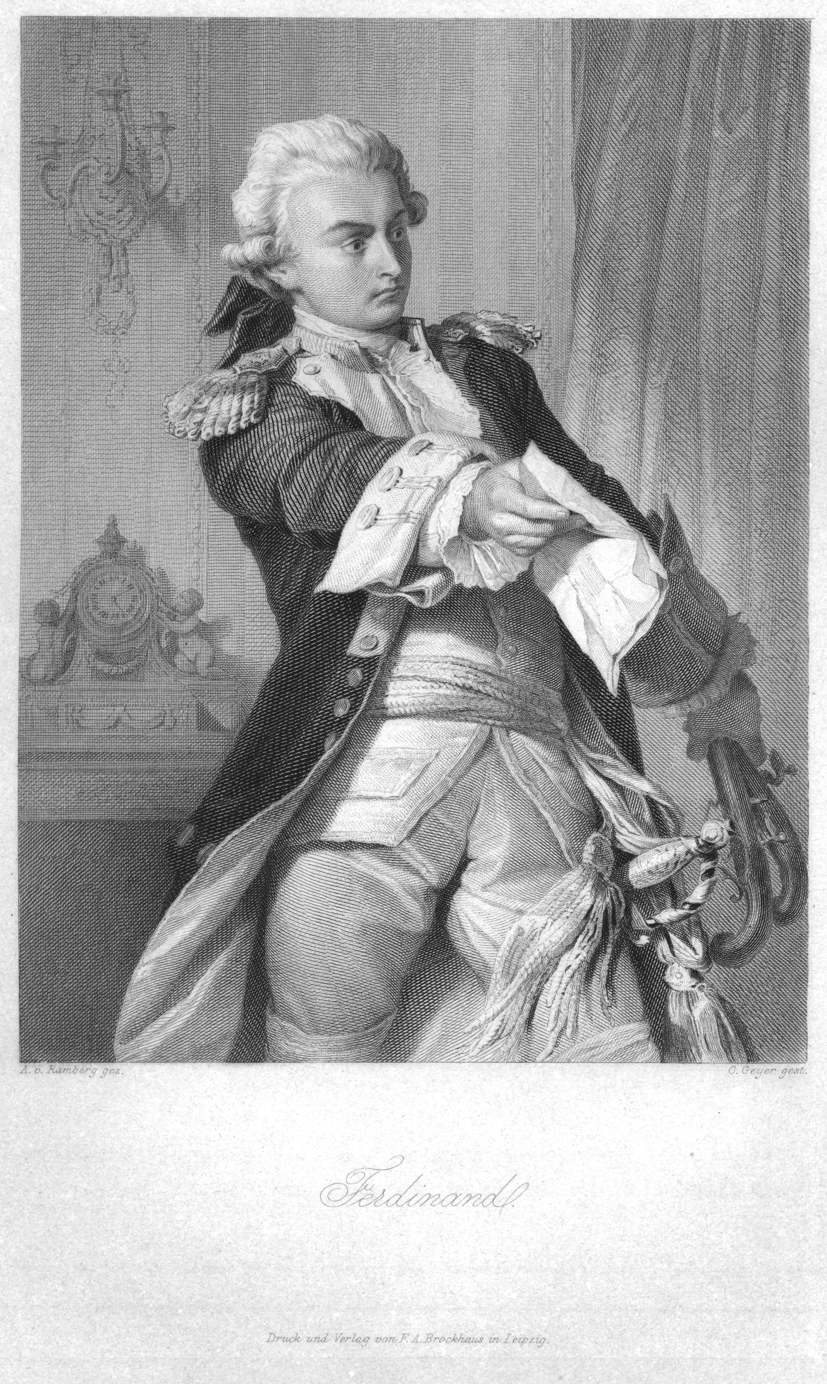 '''페르디난트'''는 열정적이고, 격정적이며, 비현실적이고 자기 몰입적인 전형적인 슈투름 운트 드랑의 대표자이다. 일반적으로 중산층 루이제는 의장의 아들에게 부적절한 신부로 여겨진다. 그러나 페르디난트는 사회 계급보다는 사람들의 개인적인 자질에 더 신경을 쓴다. 계몽주의 전통에 따라 그는 궁정 세계의 음모를 경멸한다. 그는 절대 군주제의 불의, 비인간성, 부도덕함을 비난한다. 그는 질서를 깨뜨리려 하고, "자연"과 "신"에게 호소한다. 그의 소유적 사고방식과 루이제에 대한 절대적인 사랑(다소 자기 몰입적임)은 그의 감정적인 행동과 연결되어, 장 자크 루소의 동시대 교리와 특징을 이루며, 극 초반부터 루이제를 향한 근거 없는 질투로 이어진다. 절대적인 사랑이라는 생각에 사로잡힌 그는 복수자의 역할을 맡아 무고한 사람을 죽인다.