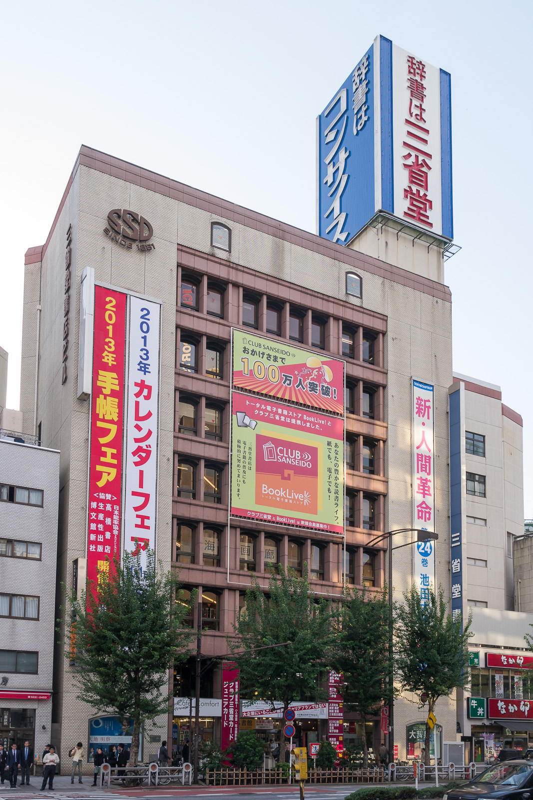 - 고서점가: 세계 최대 규모의 고서점가로, 간다 고서점 축제, 진보초 북 페스티벌 등 책 관련 행사가 매년 열린다.[13] 산세이도 서점 진보초 본점은 이 지역의 랜드마크였으나, 건물 재건축으로 2022년 3월 임시 폐점하고 간다 오가와마치에서 임시 영업 중이다. 대부분의 고서점은 야스쿠니 거리에 있으며, 책 손상을 막기 위해 북쪽을 향하고 있다.[12]