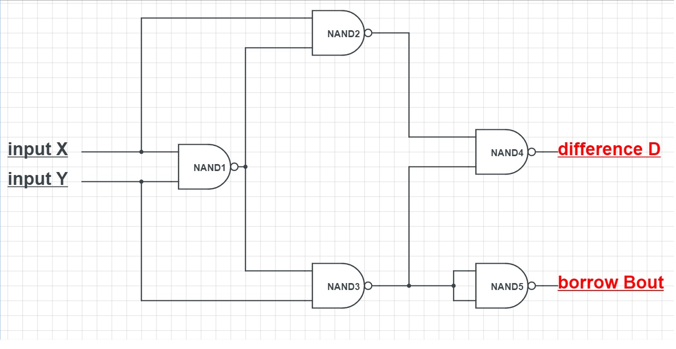 반감산기는 NAND 게이트만으로도 구현할 수 있다 (그림 2).
