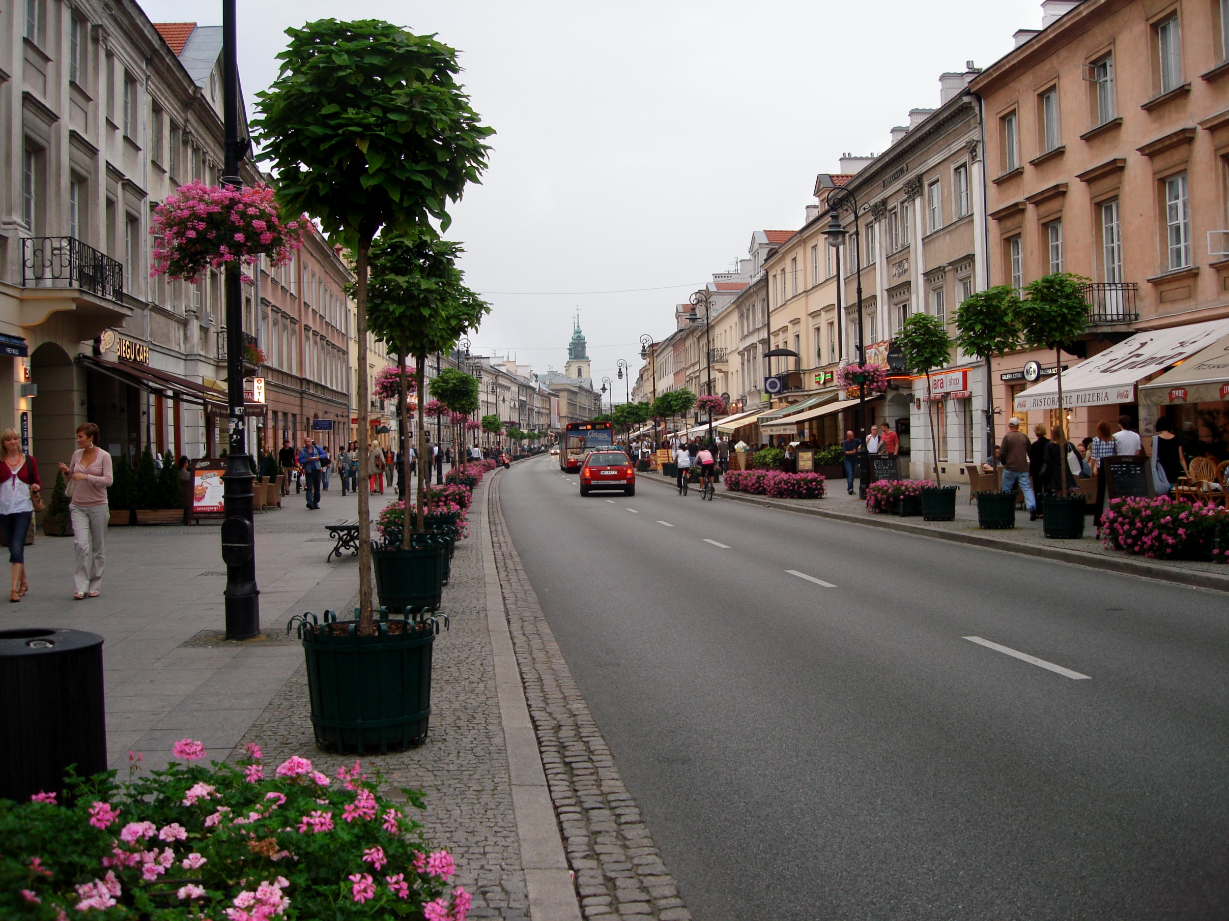바르샤바에서 차량과 보행자를 분리하기 위해 자갈과 화분과 함께 사용되는 현대식 석재 연석 볼라드