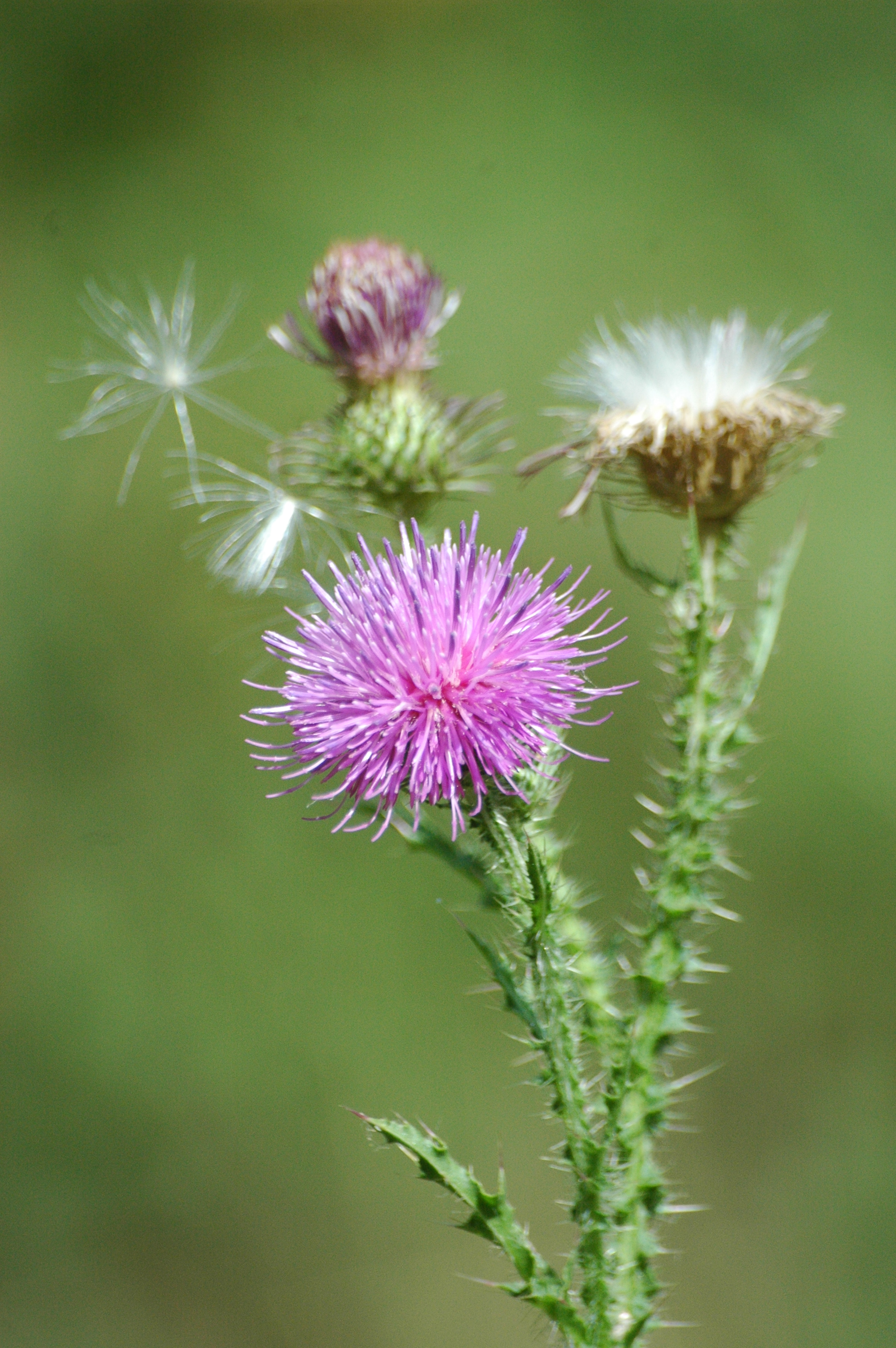 줄기 각 가지 끝에는 하나 또는 여러 개의 꽃차례가 달리는데, 각 꽃차례는 둥글고 가시가 있는 총포로 덮여 있으며, 많은 실 모양의 자주색 또는 분홍색 관상화를 맺는다. 각 꽃차례의 지름은 약 약 1.27cm에서 약 2.54cm 정도이다. 여름부터 초가을에 걸쳐 꽃을 피운다. 열매는 길이가 2mm에서 3mm 정도인 네모진 모양이며, 희미한 세로 줄무늬가 있다. 솜털 같은 관모의 길이는 11mm에서 13mm 정도이다. 꽃이 피고 씨앗을 맺으면 식물은 죽는다.