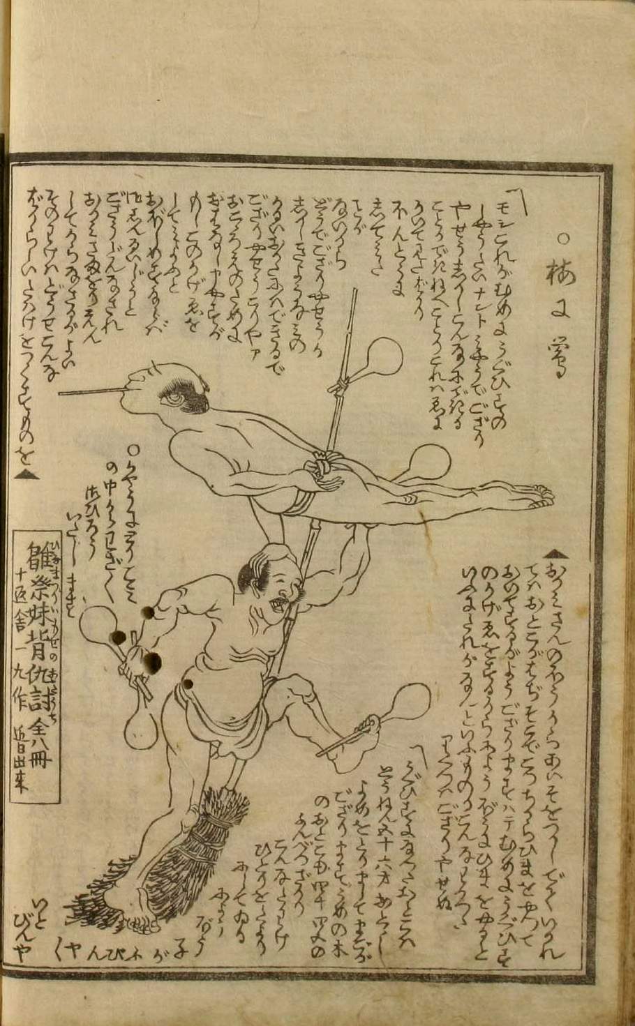 우스꽝스러운 이야기이다. 식정 삼마의 『우키요부로』, 십반사 잇쿠의 『도카이도중 무릎 굽히기』 등이 대표적이다.