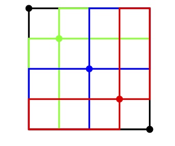 아래 그림과 같이 NE 격자 경로의 제곱을 동일한 직사각형 배열에 겹쳐보면, 에서 까지의 모든 NE 격자 경로가 고려됨을 알 수 있다. 특히, 빨간색 격자점을 통과하는 모든 격자 경로는 격자 경로의 제곱 집합(빨간색으로 표시됨)에 의해 계산된다.