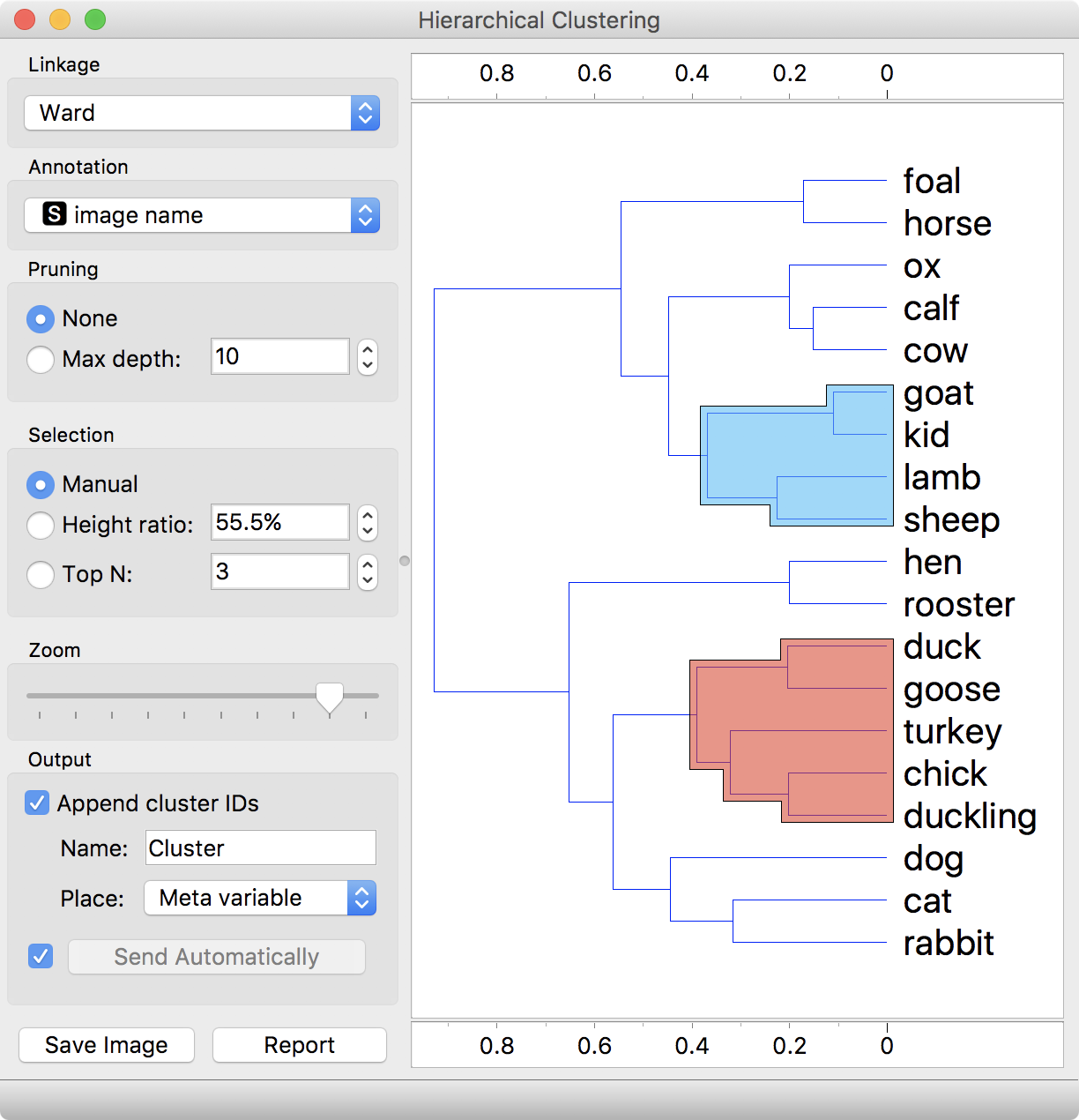 예를 들어, 위 그림의 데이터를 유클리드 거리를 거리 척도로 사용하여 군집화한다고 가정해 보자. 이 과정을 시각화한 것이 오른쪽의 덴드로그램이다. 덴드로그램을 특정 높이에서 가로로 자르면, 그 높이에 해당하는 군집 구조를 얻을 수 있다. 예를 들어, 덴드로그램의 위에서 두 번째 가로선(병합 단계) 이후에 자르면 {a}, {b c}, {d e}, {f}라는 4개의 군집이 생성된다. 세 번째 가로선 이후에 자르면 {a}, {b c}, {d e f}라는 3개의 군집이 생성되며, 이는 군집 수는 적지만 각 군집의 크기는 더 큰, 상대적으로 덜 세분화된 군집화 결과이다.