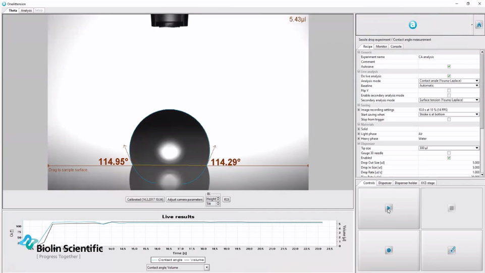 표면 과학자들은 접촉각, 표면에너지 및 표면 장력을 측정하기 위해 접촉각 고니오미터를 사용한다.