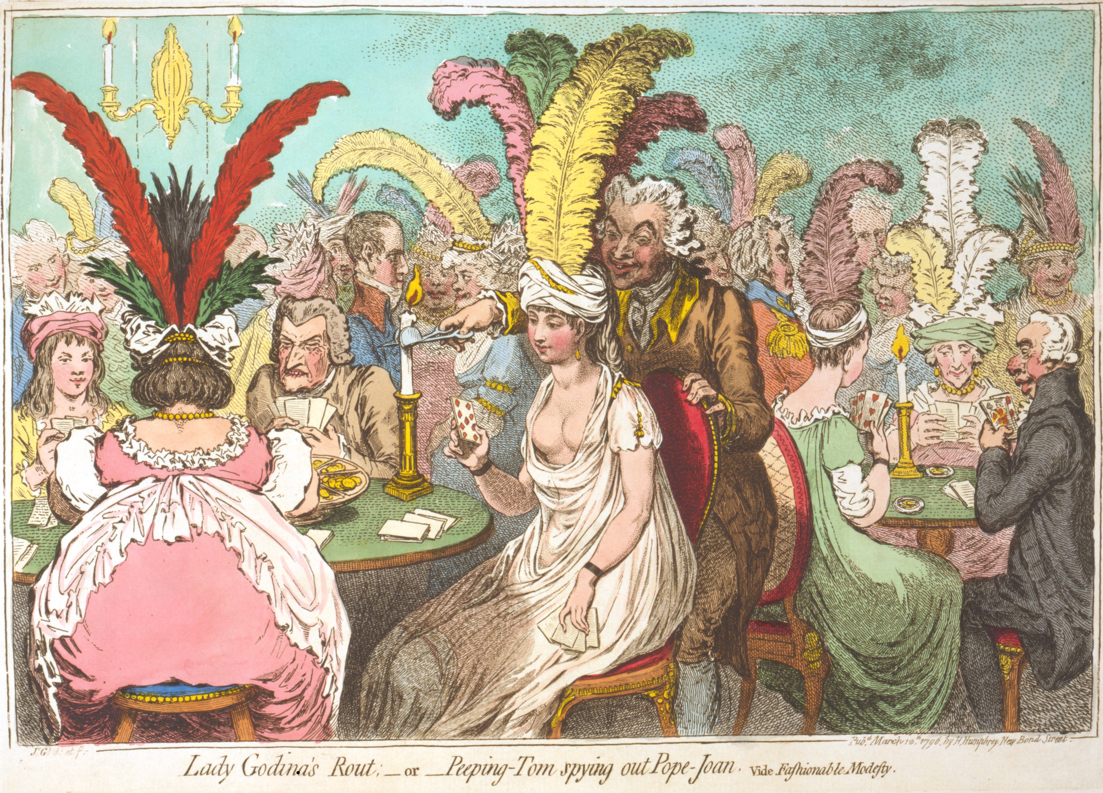영국의 풍자화가 제임스 길레이는 ''고다이바 부인의 패배—혹은—피핑 톰의 교황 요한 엿보기''(1796년)에서 당시 유행을 풍자하며 고다이바 전설을 활용했다.