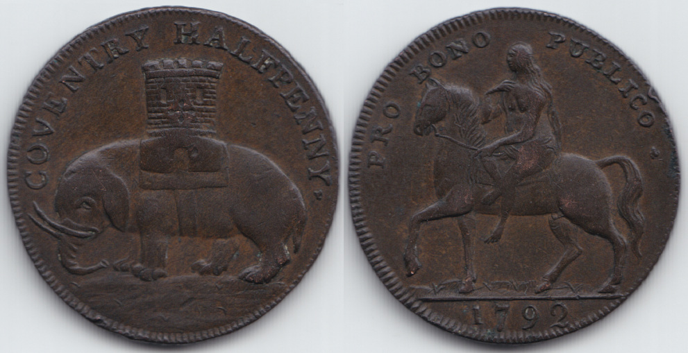 1792년, 고다이바 부인은 코번트리 하프페니 콘더 토큰 뒷면에 묘사되었다. 이것은 18세기 후반과 19세기 초(영국의 산업혁명 시대)에 영국에서 주조되고 사용된 사설 주조 토큰 화폐이다.[45]