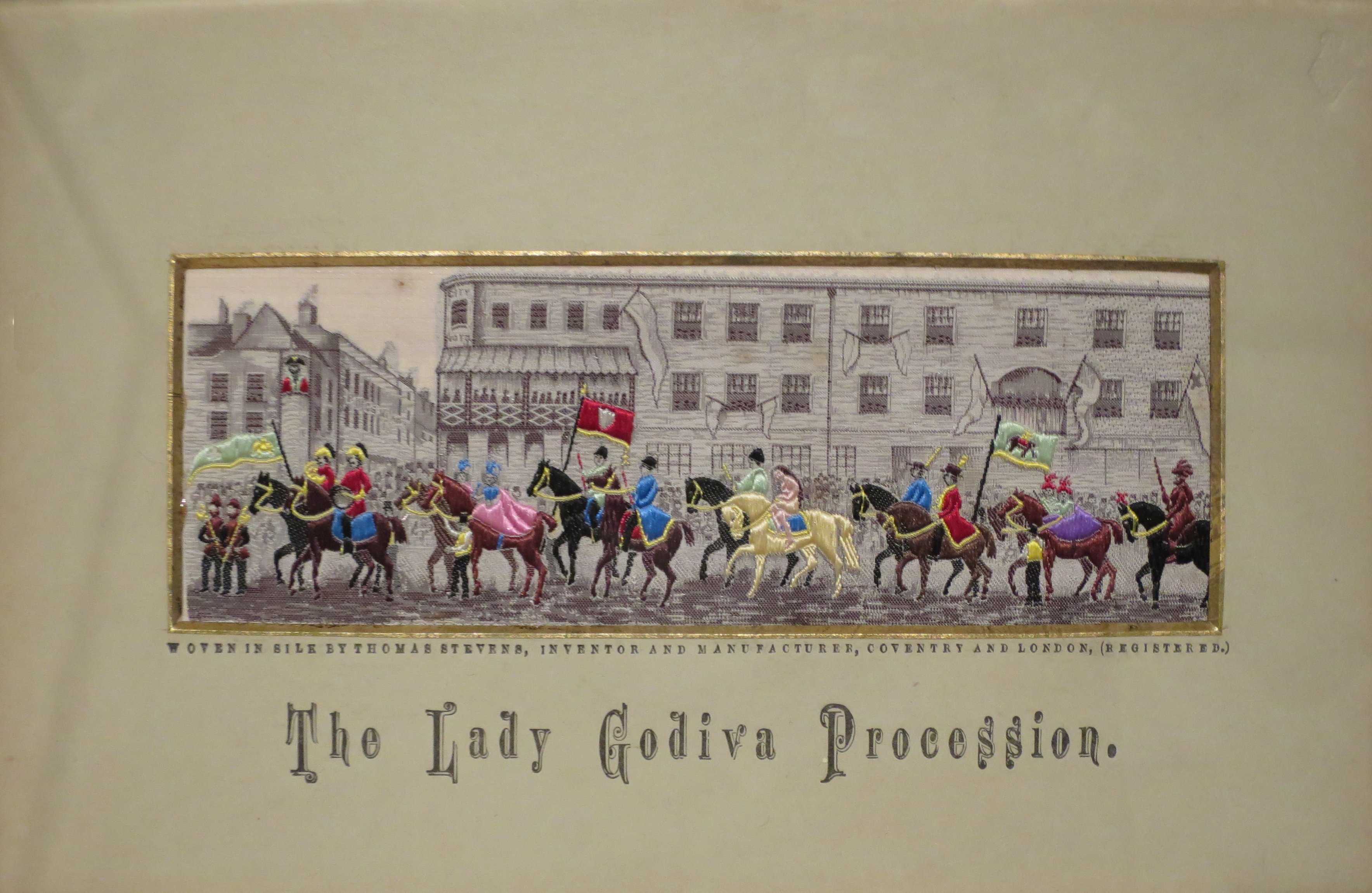 스티븐그래프 직조 실크 그림 "고다이바 부인 행렬", 코번트리 직조공이자 발명가 토마스 스티븐스(직조공)가 제작하고 현재 호놀룰루 미술관에 소장되어 있음