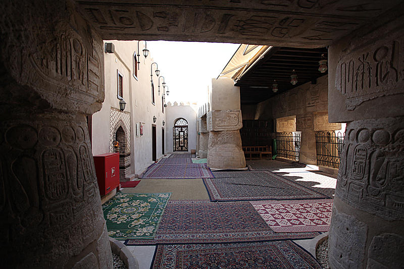 열주 너머에는 주랑 현관 안뜰이 있는데, 이 안뜰 역시 아멘호테프의 원래 건설로 거슬러 올라간다. 가장 잘 보존된 기둥은 동쪽에 있으며, 이곳에서 원래 색상의 흔적을 볼 수 있다. 이 안뜰의 남쪽은 36개의 기둥으로 이루어진 홀(즉, 기둥으로 지지되는 지붕이 있는 공간)으로 구성되어 있으며 신전의 어두운 내부 방으로 이어진다.