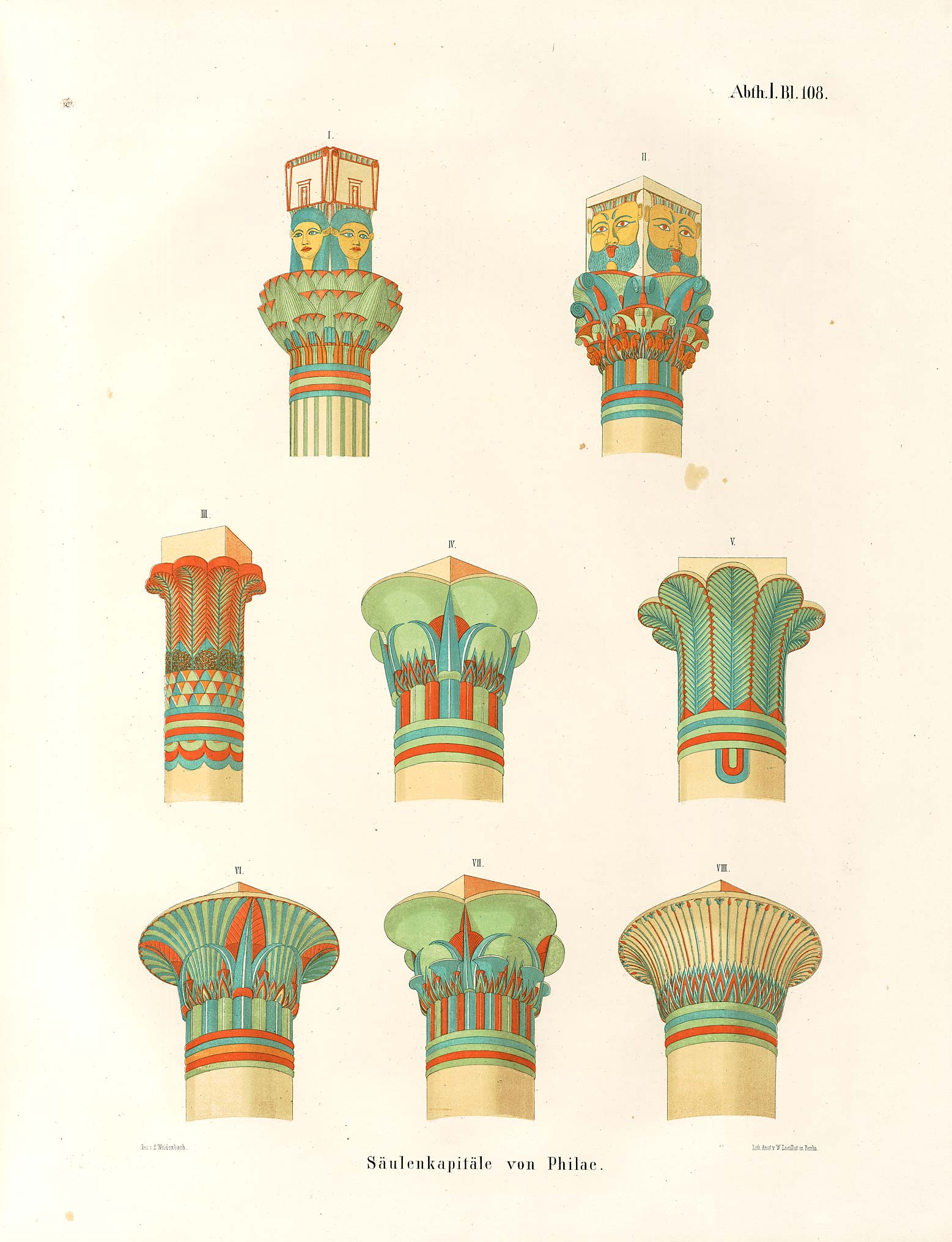 건축용 기둥에는 목재도 사용하였으나 현존하는 것은 모두 석재이다. 거의 모두가 식물을 모형으로 했는데, 야자수형 기둥은 연 줄기 묶음의 기둥에 꽃봉오리나 활짝 핀 꽃의 기둥머리를 붙인 것이며 파피루스형 기둥도 그와 같다. 프톨레마이오스 왕조에 이르면 이러한 복합형도 열 종류가 있다. 주두에 하트홀 여신 얼굴의 주두를 붙인 것도 있다. 화강암·석회암·사암이 주로 사용되었고, 한 개만으로 된 돌 기둥이나 드럼형(型)의 돌을 쌓아 올린 기둥도 있고 비문(碑文)을 파서 채색한 경우도 있다.