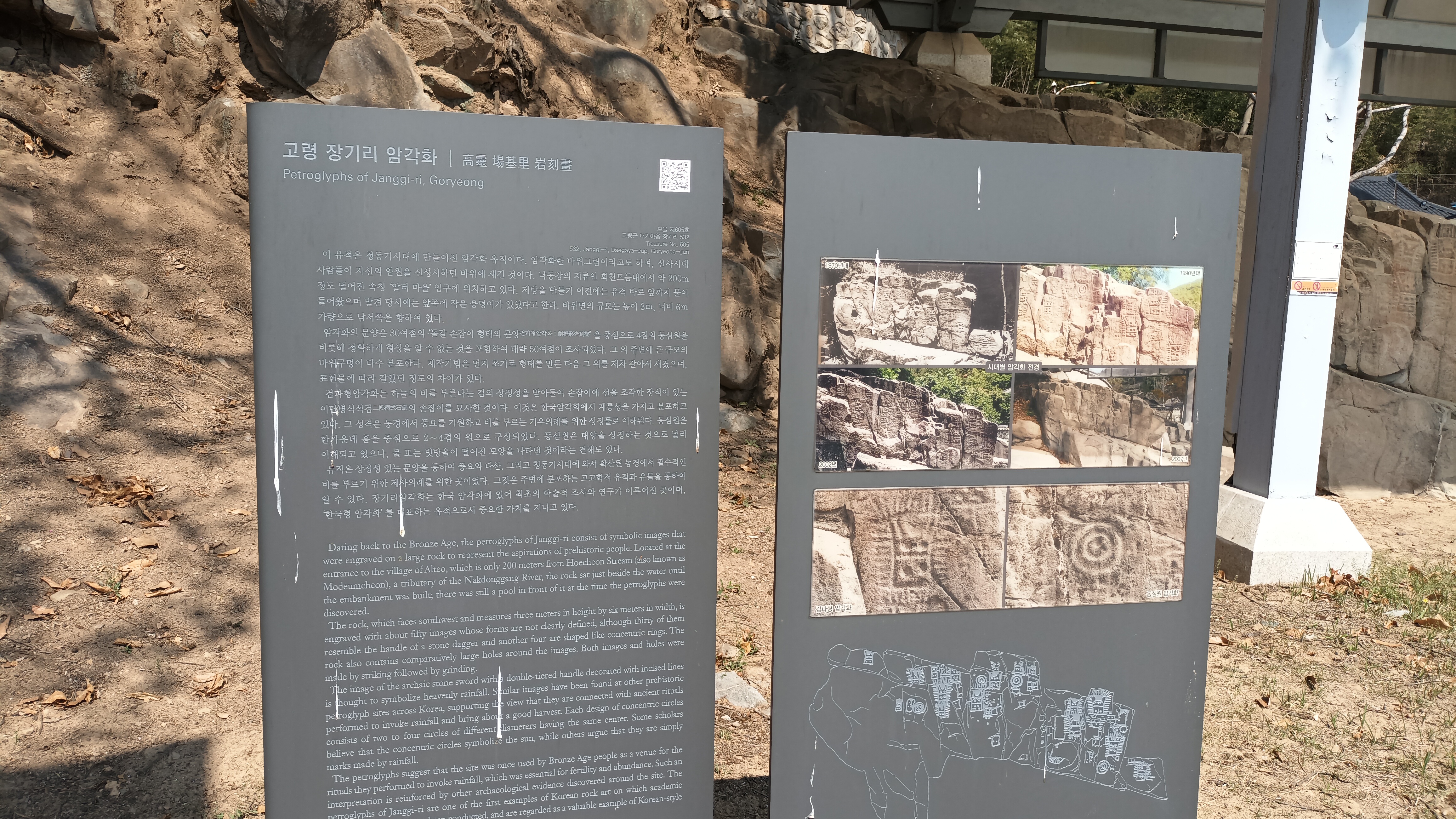 고령 장기리 암각화는 경상북도 고령군에 위치한 알터 마을 입구의 하산동층 암벽에 새겨진 바위그림이다. 동심원, 십자형, 가면 모양 등의 그림이 있으며, 청동기 시대 후기에 제작된 것으로 추정된다. 태양신 숭배, 부족 사회 생활, 부적 등 다양한 의미를 담고 있으며, 선사 시대의 신앙과 사회생활 연구에 중요한 자료로 평가받는다. 암각화가 새겨진 하산동층은 중생대 백악기에 형성된 퇴적암 지층으로, 역암, 사암 등으로 구성되어 있다.