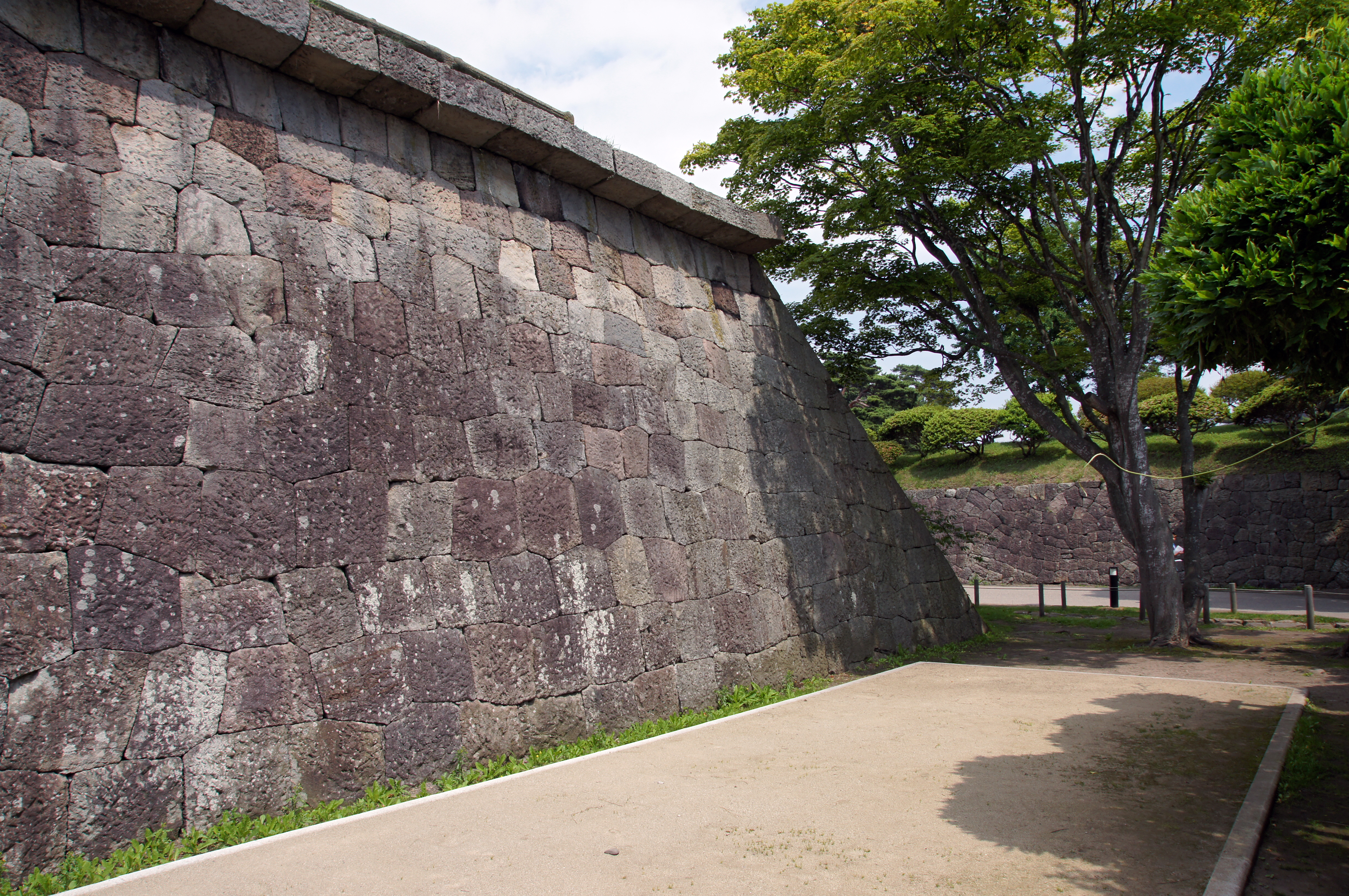 당초에는 총호 외에도 토루 전체에 석축을 쌓는 "서양식 석축 어전비"를 계획했지만, 비용이 많이 들고 돌을 채석하는 데 시간이 걸려 중단되었으며,[20] 석축은 해자 외에 반월보와 성곽 내 입구 주변에만 축조되었다.[66] 하코다테 산 등에서 채석한 석재를 사용했지만, 해자 석축에서는 자금 부족으로 아카가와와 가메다 강의 돌을 모아 대체한 곳이 있다(우라몬 다리 측 일부에서 볼 수 있다).[67] 반월보와 오테구치의 본루 최상부에는 "하네다시(무사반시)"가 달려 있다.