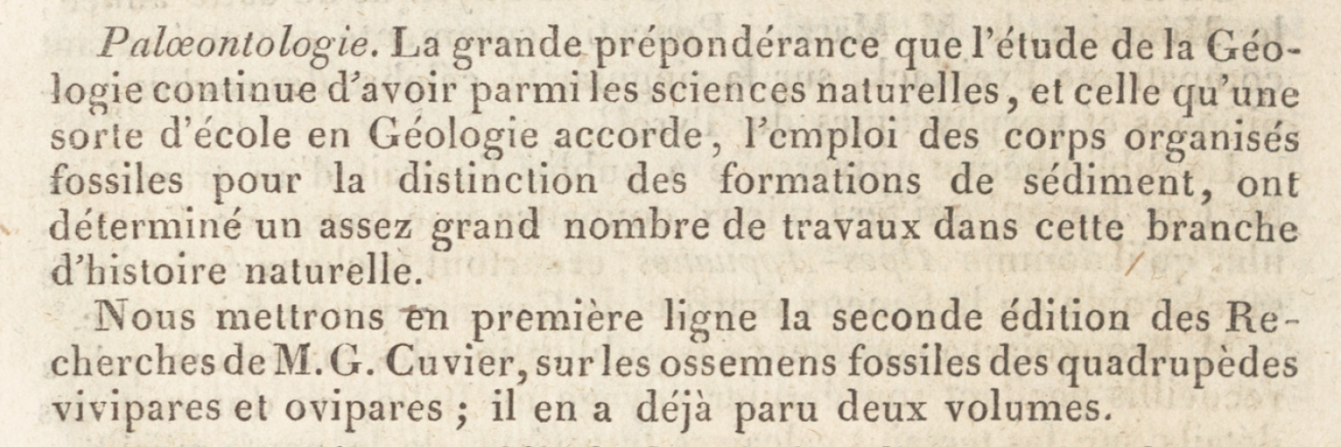조르주 퀴비에의 ''Recherches sur les ossements fossiles de quadrupèdes''(사족 보행 동물 화석 연구)는 1812년 프랑스에서 출판되었으며, 스미소니언 도서관은 이 책을 척추 고생물학의 토대를 마련한 작품으로 평가한다.[123][32] 1822년 1월, 퀴비에의 제자이자 과학 간행물 ''Journal de physique''의 편집자인 앙리 마리 뒤크로테 드 블랑빌은 "Analyse des principaux travaux dans les sciences"라는 기사에서 ''palæontologie''[124][33]라는 단어를 처음으로 사용했다. 이 단어는 이후 영어 단어 "paleontology"(고생물학)의 어원이 되었다. 블랑빌은 1817년에 이미 ''고생물학(paléozoologie)''이라는 용어를 만들었지만, 화석 동물과 식물 모두를 아우르는 용어를 찾기 위해 노력했고, 1822년에 "고생물학(palaeontologie)"이라는 용어를 고안했다.[125][34] 블랑빌의 용어는 빠르게 대중화되었고, "paleontology"로 영어화되었다.[34]
