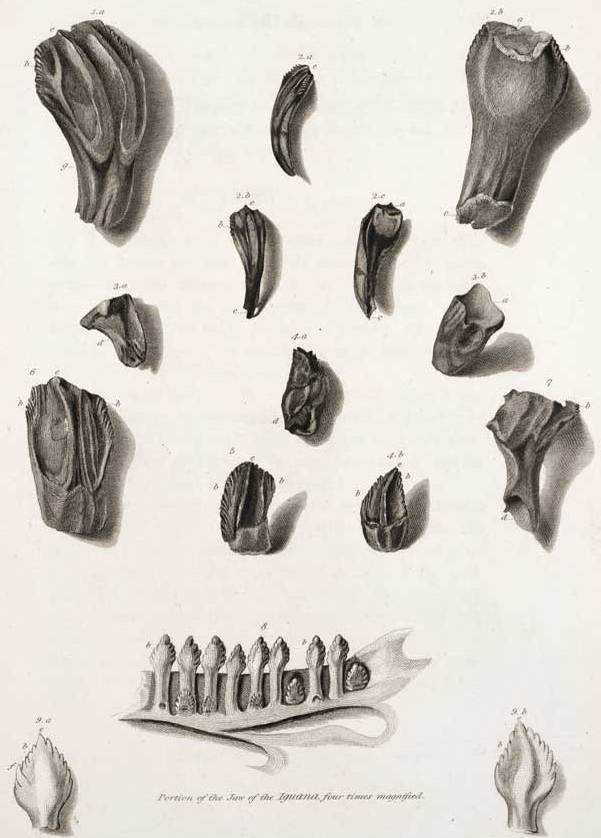 1824년, 윌리엄 버클랜드는 스톤스필드의 쥐라기 퇴적층에서 아래턱뼈를 발견하고 ''메갈로사우루스''라고 명명했다. 같은 해 기디언 만텔은 1822년 틸게이트의 백악기 암석에서 발견한 큰 이빨이 거대한 초식성 육상 파충류의 것이라는 것을 깨닫고, 이구아나의 이빨과 유사하다는 점에 착안하여 ''이구아노돈''이라고 명명했다.[132] 1832년, 만텔은 틸게이트에서 갑옷 파충류의 부분 골격을 발견하고 ''힐라에오사우루스''라고 명명했다. 1841년, 영국의 해부학자 리처드 오웬은 ''메갈로사우루스'', ''이구아노돈'', ''힐라에오사우루스''를 공룡이라는 새로운 분류군으로 묶었다.[133]
