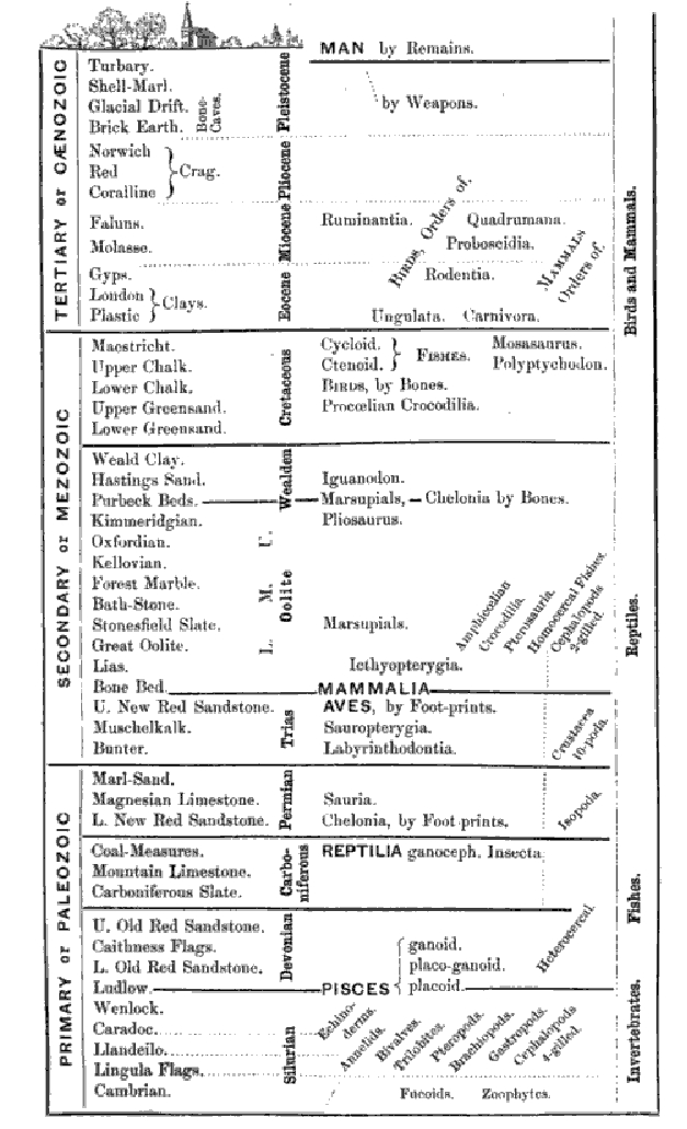 지질학자 애덤 세지윅과 로데릭 머치슨은 데본기 대 논쟁과 같은 논쟁을 벌이면서 층서학 발전을 지속했다. 그들은 캄브리아기, 실루리아기, 데본기, 페름기와 같은 새롭게 인식된 지질 시기를 묘사했다. 층서학의 이러한 진보는, 윌리엄 론스데일(화석 산호)과 존 린들리(화석 식물)와 같이 특정 유형의 화석에 대한 전문 지식을 가진 전문가들의 의견에 점점 더 의존하게 되었는데, 이들은 둘 다 데본기 논쟁과 그 해결에 중요한 역할을 했다.[70] 1840년대 초까지 지질 연대표의 상당 부분이 개발되었다. 1841년, 존 필립스는 화석 기록의 뚜렷한 단절을 기준으로 지질주상도를 고생대, 중생대, 신생대의 세 주요 기로 공식적으로 구분했다.[71] 그는 중생대의 세 기와 오르도비스기를 제외한 고생대의 모든 기를 확인했다. 그의 지질 연대표 정의는 오늘날까지도 사용되고 있다.[72] 그것은 상대적인 연대표로 남아 있었고, 어떤 기간의 절대적인 날짜를 할당하는 방법은 없었다. 현재의 "포유류의 시대"에 앞서 "파충류의 시대"가 있었을 뿐만 아니라, 생명체가 바다에 제한되었던 시기 (캄브리아기와 실루리아기 동안)와 무척추동물이 가장 크고 복잡한 형태의 동물 생명체였던 시기 (데본기 이전)가 있었다는 것을 알게 되었다.