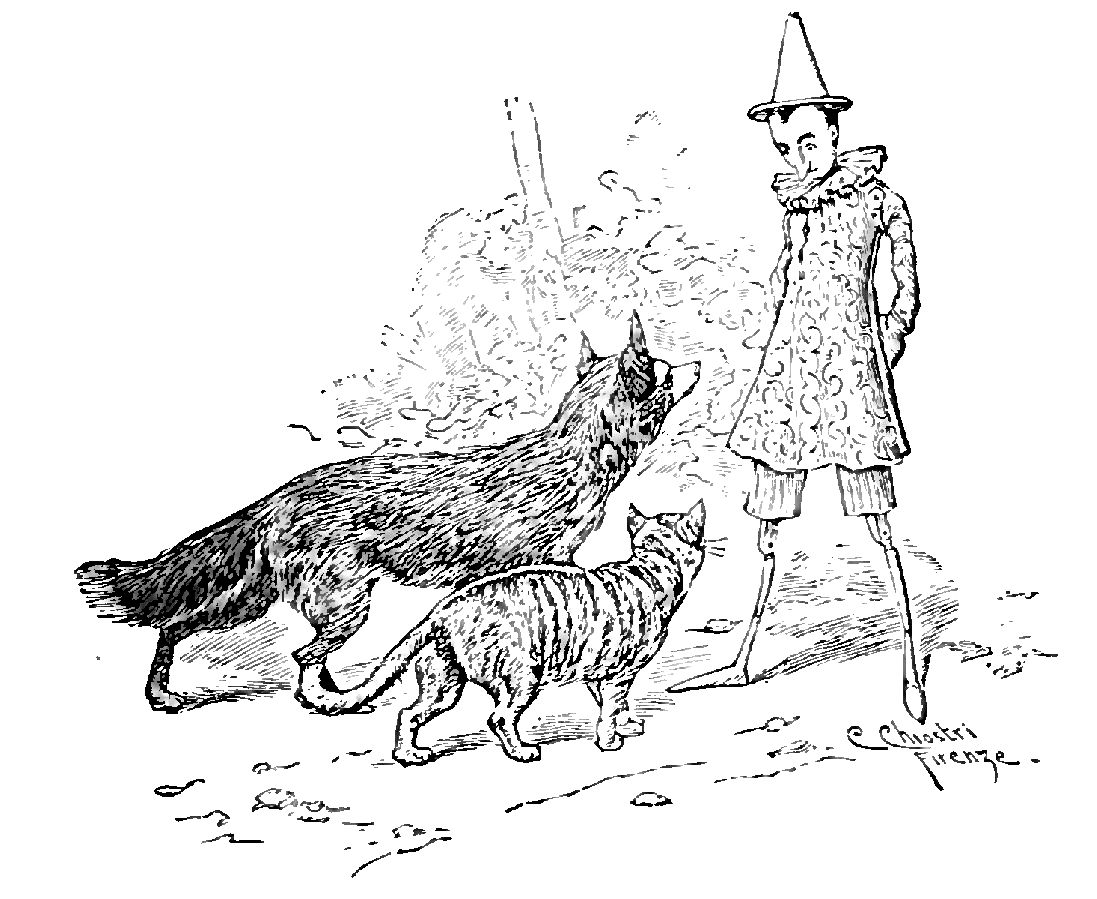 여우와 고양이는 피노키오가 만자에포코의 극장을 떠나 금화 다섯 닢(세퀸)을 가지고 있을 때 처음 등장한다. 이들은 피노키오를 속여 '기적의 밭'에 돈을 심으면 돈이 열리는 나무가 자란다고 유혹한다. 이후 피노키오를 꾀어 바보들의 마을(Acchiappacitrulli)로 데려간 후, 피노키오가 자리를 비운 사이 돈을 훔쳐 달아난다.