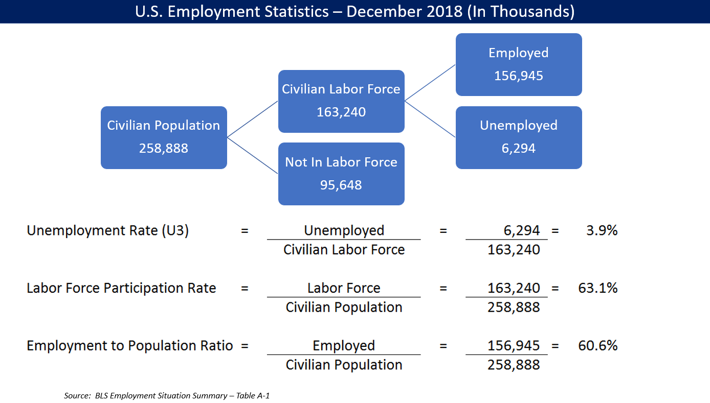 '''실업자.''' (1) 기준 주에 고용이 없는 모든 사람, (2) 일시적인 질병을 제외하고 일할 수 있는 사람, (3) 지난 4주 동안 고용주에게 연락하는 등 구체적인 노력을 기울여 고용을 찾은 모든 사람.[12]2. 3. 노동참가율
