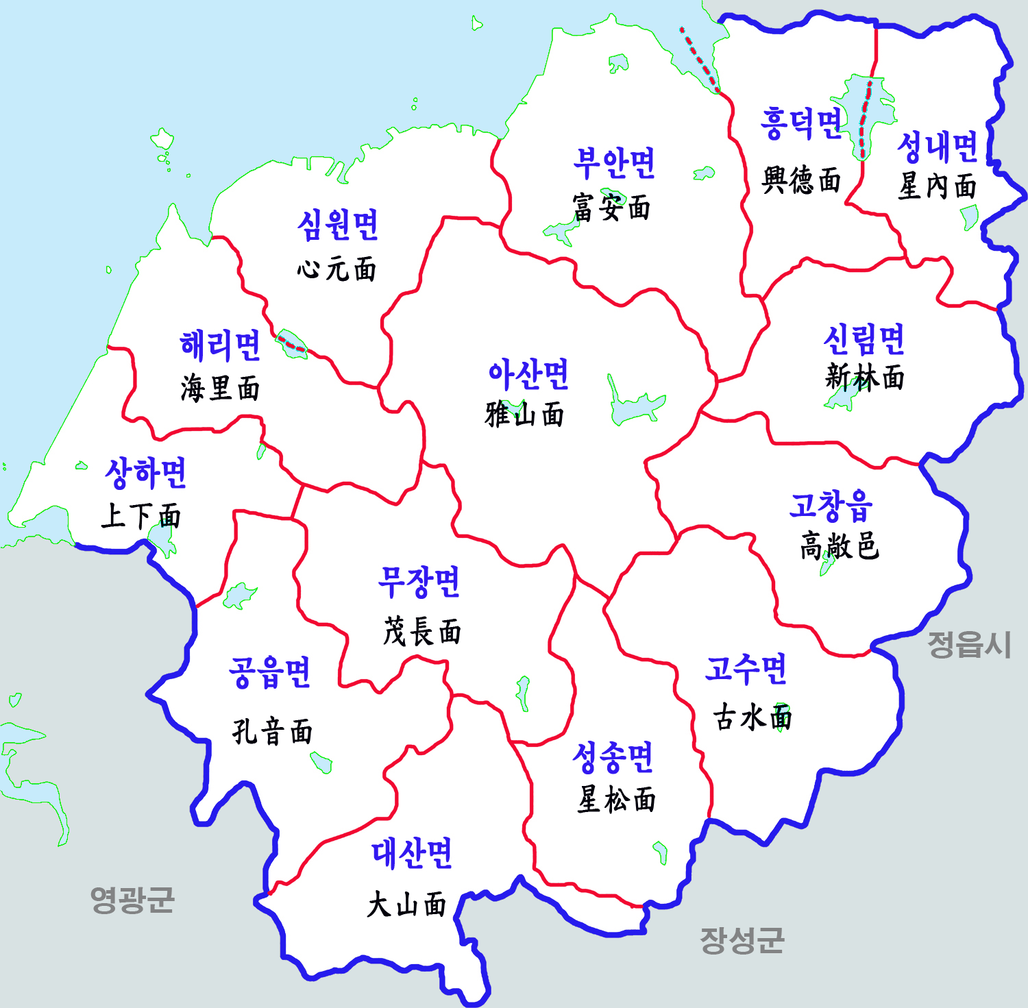 무장면 | 茂長面 | 1,700 | 3,352 | 43.78km2 |