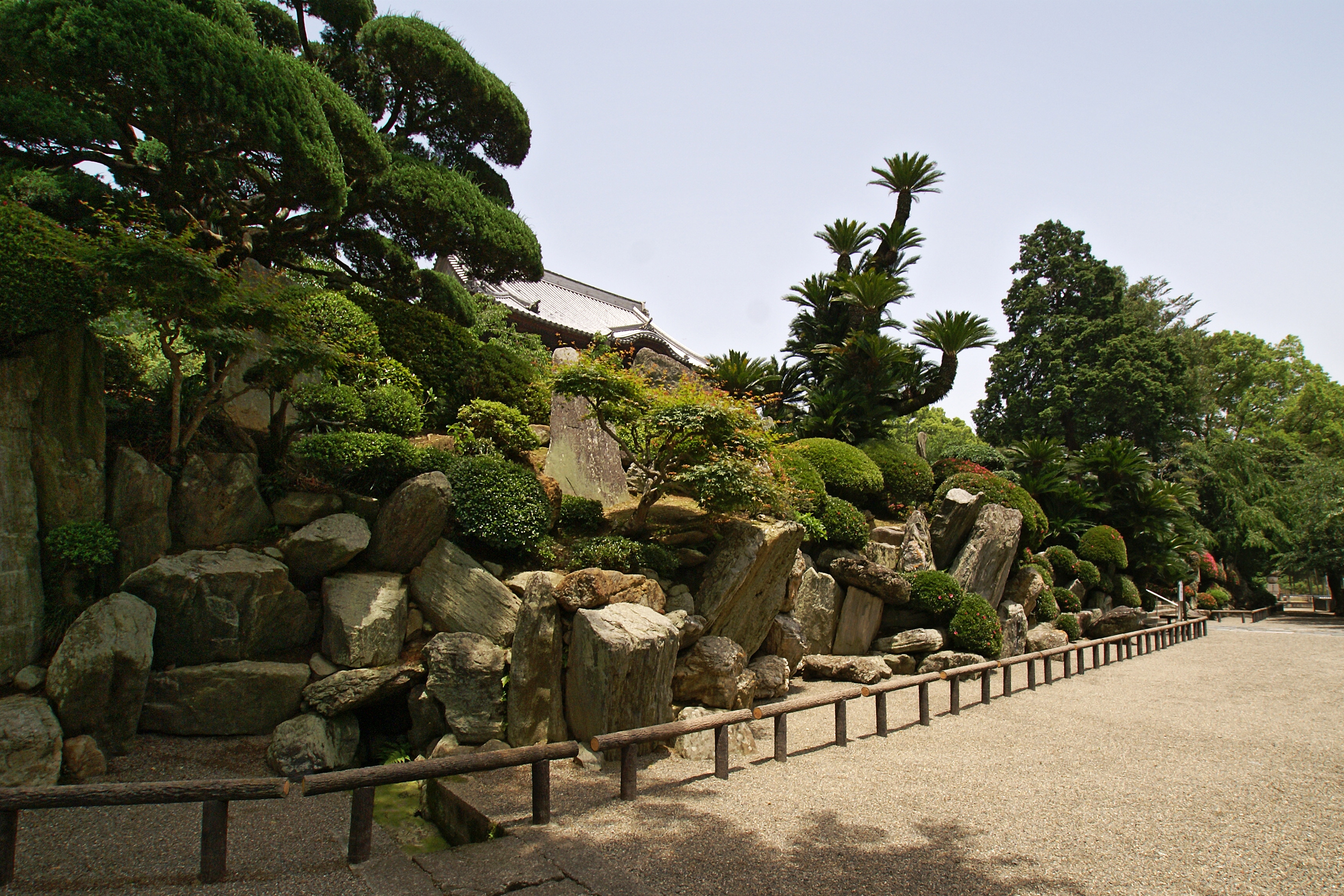 중문에서 약 3미터 높이의 돌계단을 통해 본당으로 가는 길 양쪽에 조성된 정원이다. 녹니편암을 주재료로 하고, 여러 거대한 암석을 이용해 만들었다. 진달래와 노간주, 능수 벚나무, 소철 등을 함께 심었다. 아즈치모모야마 시대의 호화로운 양식을 보여주며, 에도 시대 초기에 만들어진 것으로 추정된다.[11]
