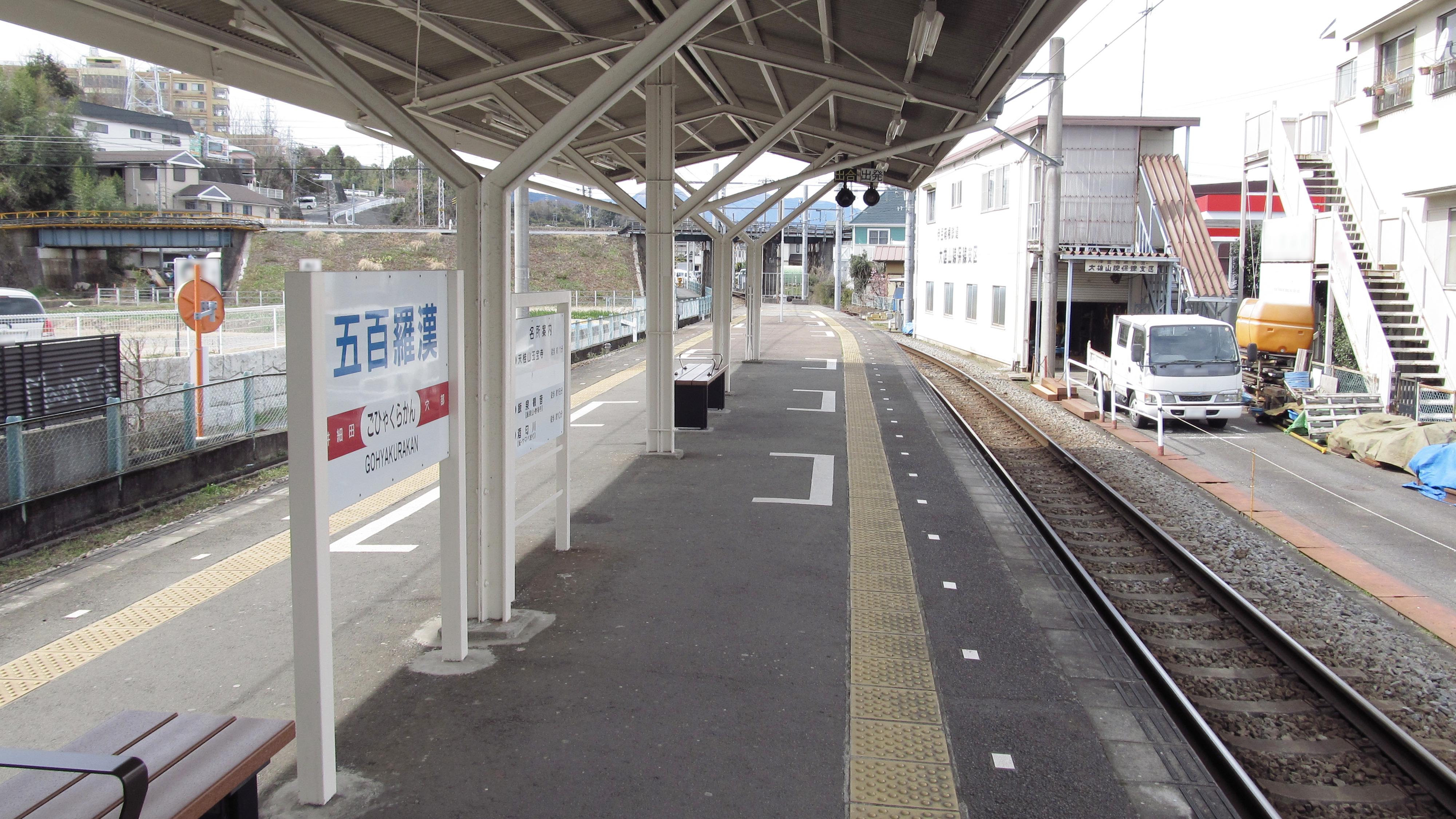 역 앞을 가나가와현도 720호 이카리다 가이세이 오다와라선이 지나간다. 역명의 유래가 된 오백 나한상이 있는 교쿠호 사찰과 다코성터 등 주변에는 옛터가 많이 존재한다.[30]