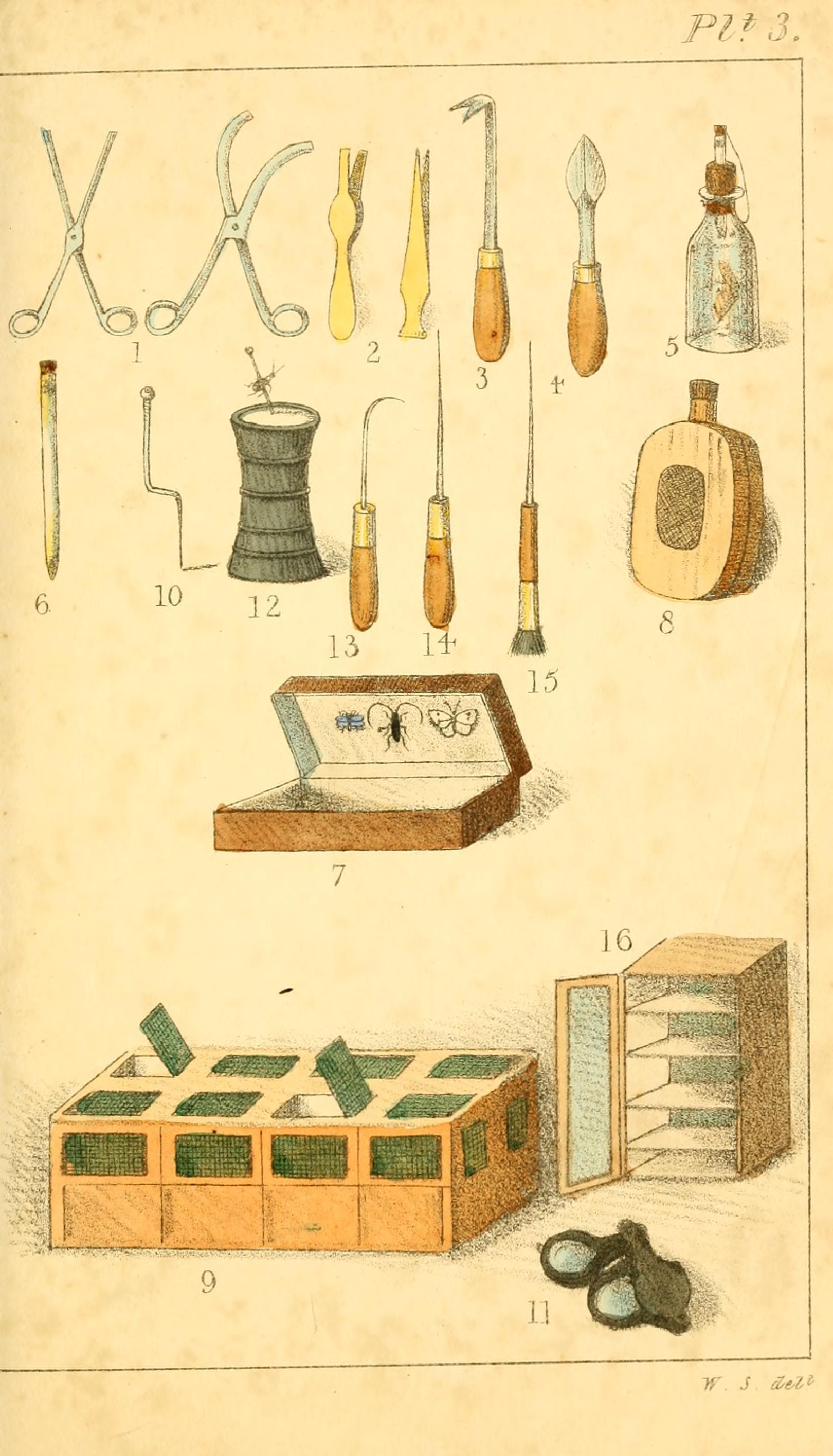 Fig. 1 Pincher forceps、Fig. 2 Pliers、Fig. 3 A digger、Fig. 4 A bark knife、Fig. 5 A phial、Fig. 6 A quill、Fig. 7 A pocket collecting box、Fig. 8 A pocket larvae box、Fig. 9 Breeding cage、Fig. 10 A bent pin、Fig. 11 Pocket lens、Fig. 12 A stand、Fig. 16 Setting board cases