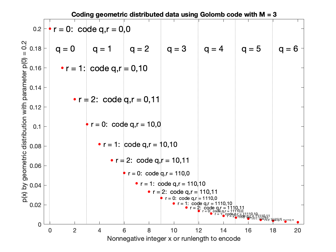 골롬-라이스 코드는 숫자를 'bin'(q)의 위치와 'bin' 내의 'offset'(r)으로 나타내는 코드로 생각할 수 있다. 아래 그림은 골롬-라이스 매개변수 M = 3을 사용하여 정수 x를 부호화하는 위치 q와 offset r을 보여주며, 소스 확률은 p(0) = 0.2인 기하 분포를 따른다.