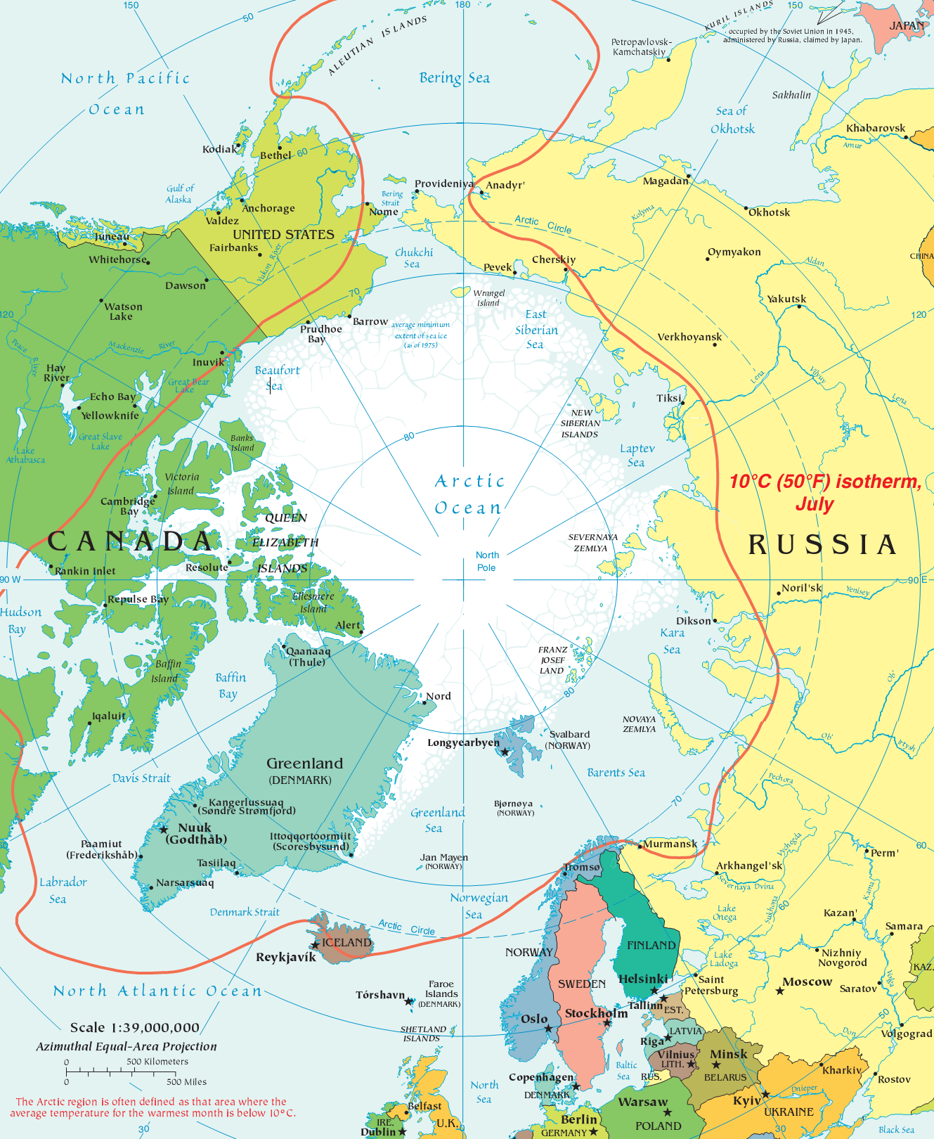 북극 지역은 대부분 바다로 구성되어 있으며, 해당 해역은 다른 지역과 마찬가지로 내수, 영해, 접속 수역, 배타적 경제 수역, 공해 등으로 구분된다.[70][71] 예를 들어 북극점에 어느 나라의 국기를 게양하더라도, 북극점이 공해상에 위치하는 이상 공해 자유의 원칙이 적용되어 북극점 빙상이 그 나라의 영토가 되는 것은 아니다.[71] 그러나 북극해 연안국 중에는 독자적인 이론으로 일부 해역이나 섬의 영유권을 주장하는 나라도 있다.[70][72]
