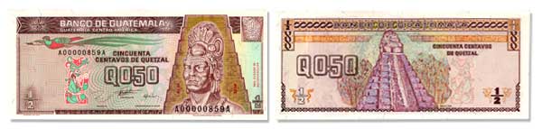 ![]() | 0.5 케찰 (1/2 케찰) | 갈색 | 테쿤 우만(Tecún Umán), 키체 왕국의 왕자이자 총사령관 | 티칼 1호 사원 | 현재 유통되지 않음 (동전으로 대체) | |