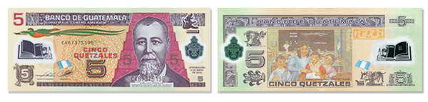 ![]() | 5 케찰 | 보라색 | 후스토 루피노 바리오스(Justo Rufino Barrios), 1871년 자유주의 혁명 지도자 | 교육 상징 그림 (학교 교육) | 2011년 11월 14일 폴리머 지폐로 발행[5] | |