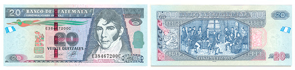 ![]() | 20 케찰 | 파란색 | 마리아노 갈베스(Mariano Gálvez), 중앙아메리카 연방 공화국 시대 과테말라 국가 원수 | 중앙아메리카 독립 선언 서명 장면 | ||
