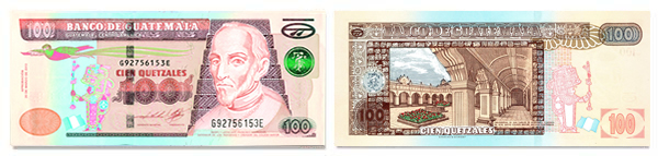 ![]() | 100 케찰 | 갈색 | 프란시스코 마로킨(Francisco Marroquín), 과테말라 초대 주교, 산 카를로스 대학교 설립자 | 안티구아 과테말라에 세워진 최초의 대학 건물 | ||