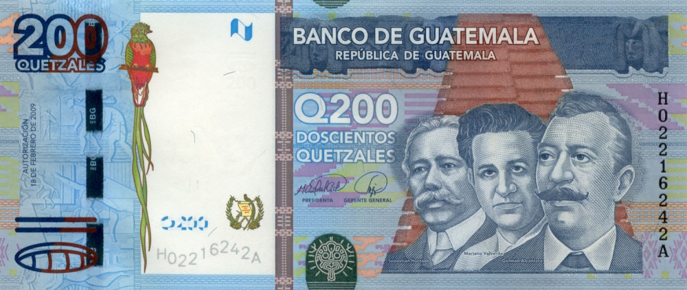![]() | 200 케찰 | 청록색 (하늘색) | 세바스티안 우르타도(Sebastian Hurtado), 마리아노 발베르데(Mariano Valverde), 헤르만 알칸타라(German Alcántara) (3명의 마림바 작곡가) | 국악기 마림바 상징 그림, 알칸타라 작곡 "라 플로르 델 카페(La Flor del Café)" 악보 |