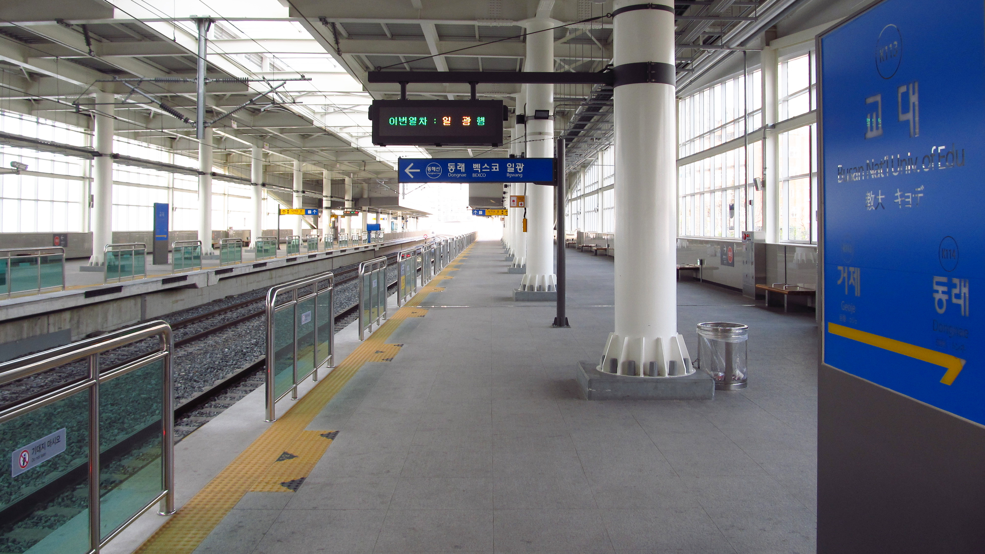 부산 도시철도 1호선과 동해선 모두 2면 2선의 상대식 승강장을 갖추고 있으며, 두 노선 모두 스크린도어가 설치되어 있다.[9][10] 부산 도시철도 1호선의 경우 곡선 승강장이기 때문에 승강장과 전동차 사이의 간격이 넓으므로 승·하차시 발이 빠지지 않도록 주의해야 한다.