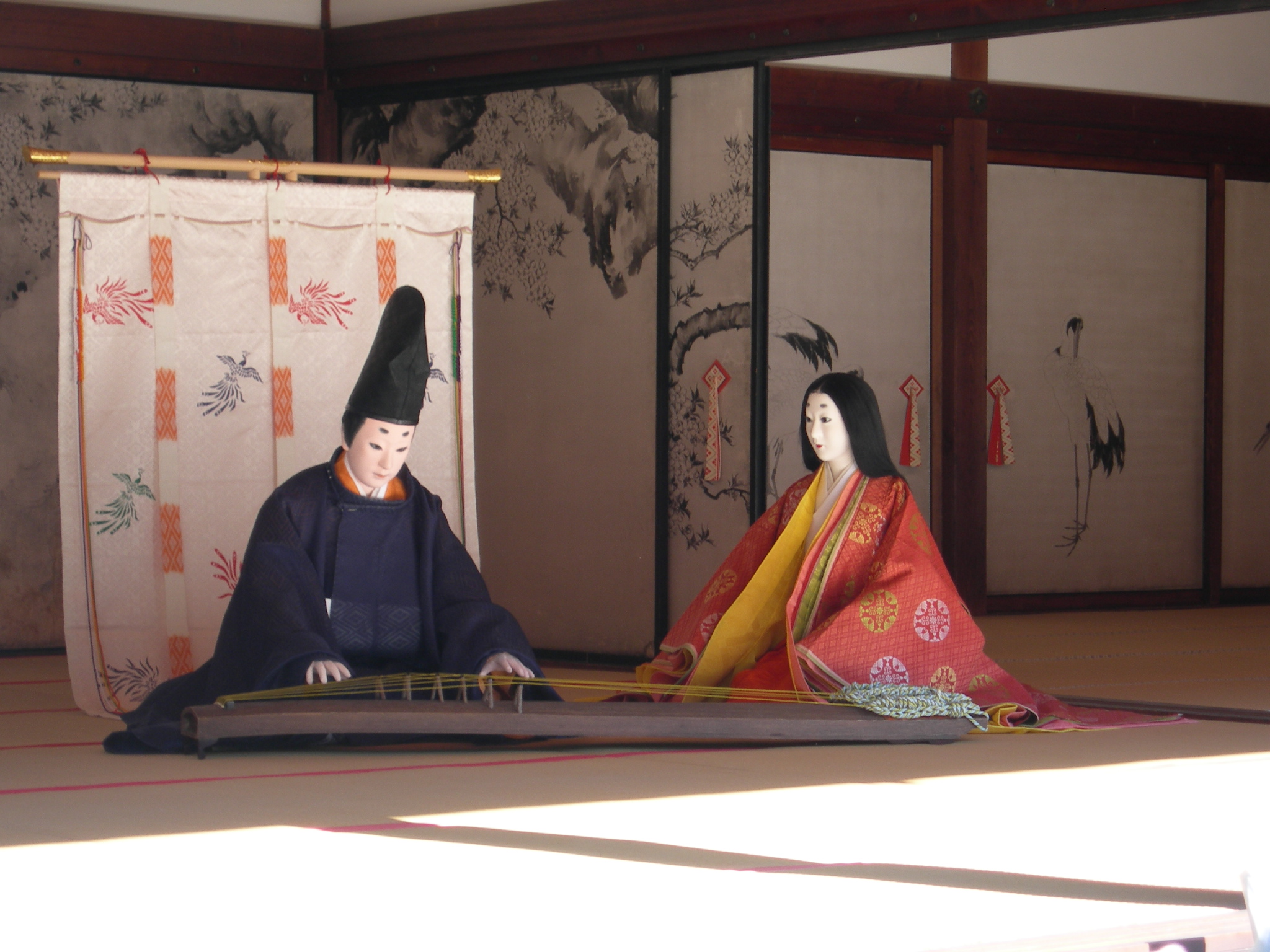 천황을 시야에서 가리는 미닫이 문은 賢聖障子|賢聖障子일본어라고 불리며, 32명의 천상의 성인이 그려져 있는데, 이 그림은 헤이안 시대 회화의 주요 모델 중 하나가 되었다.