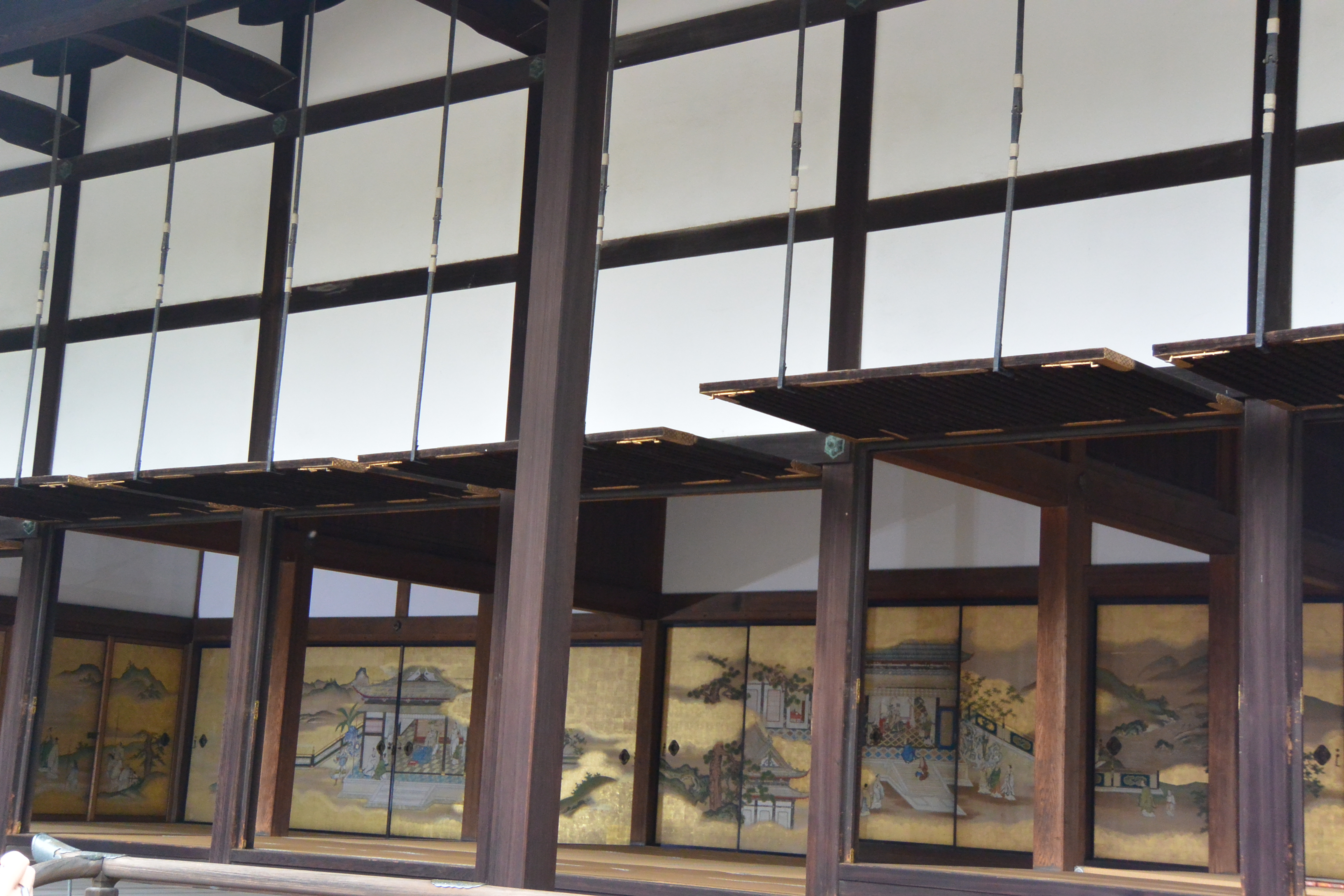 - 제대부간(諸大夫間일본어) - 제후들이 천황을 알현하기 전에 거치는 대기실이다. 동쪽에서 서쪽으로 3개의 방이 있으며, 각각 “공경의 방”(호랑이 방), “전상인의 방”(학 방), “여러 대부의 방”(벚꽃 방)이라고 불린다. 방 이름은 각 방의 칸막이 그림 주제에서 따온 것으로, 기시다이, 가노 에이가쿠, 하라 자이쇼 등이 그렸다.[53][54][55]