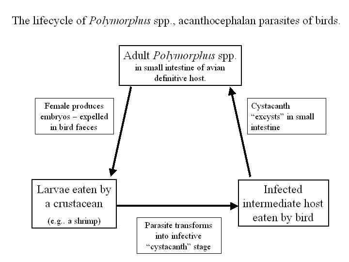 ''Polymorphus''속은 주로 솜깃털 오리, 검둥오리 등의 바다 오리와 작은 게 사이에서 순환한다. 캐나다에서 상업용 크기의 바닷가재에서 발견된 감염은 바닷가재의 주요 먹이인 게로부터 획득되었을 가능성이 높다. 바닷가재의 시스타칸스는 어부들에게 경제적 손실을 야기할 수 있으며, 예방 또는 통제 방법은 알려져 있지 않다.[27] ''Polymorphus''는 검둥오리 등 바닷새에 기생하며, 한 마리당 750마리까지 기생하여 위궤양 증상을 일으키기도 한다. 최근 연구에 따르면, ''Polymorphus''는 게에게는 병원성이 없는 것으로 여겨지며, 시스토칸트 유생 시기가 길어 게의 생애에 걸쳐 기생을 계속하는 경우도 있다.