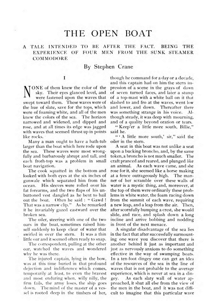 이후 크레인은 이 사건을 바탕으로 단편 소설을 쓰기 시작했고, 1897년 6월 ''스크리브너스 매거진''에 "열린 배"가 처음 게재되었다.[10]