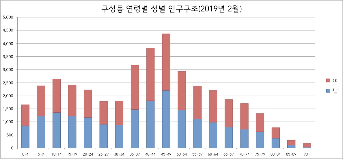 구성동의 인구는 39,907명(2019년 2월 28일 기준, 내국인)으로 용인시 전체 인구의 3.8%를 차지한다. 남자는 19,343명, 여자는 20,564명이다. 외국인은 남성 51명, 여자는 87명이다. 구성동의 인구 구조를 살펴보면 유소년(15세 미만) 인구 비율은 16.7%로 용인시 전체 16.1%보다 높으며 노년(65세 이상) 인구 비율은 15.4%로 용인시 전체 12.2%보다 많다.[3]