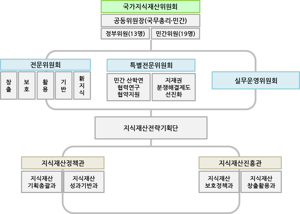 우리 경제도 양적 성장전략의 한계를 극복하기 위해 국가적인 차원에서 지식재산을 관리·육성하기 위한 전략이 요구되고 있다. 또한 부처별로 분산된 지식재산 정책을 종합적으로 기획·조정하고 유기적으로 연계하는 기능을 수행할 기구의 필요성이 제기되었다. 이에 2011년 7월 20일 지식재산기본법이 시행되었으며, 이 법 제6조에 따라 2011년 7월 28일 대통령 소속 국가지식재산위원회가 출범하였다.
