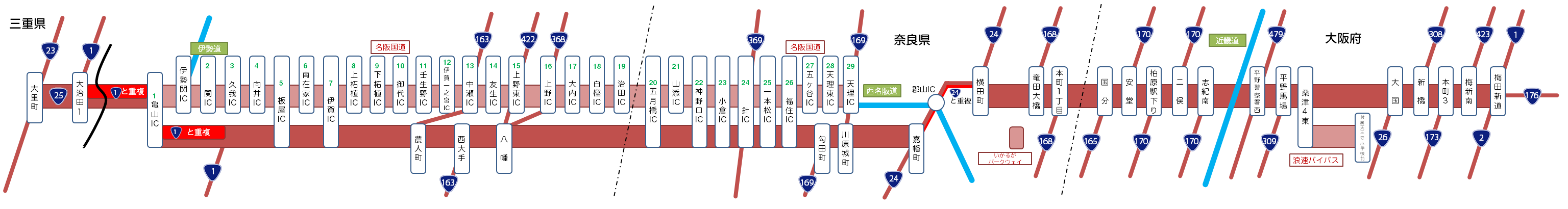주요 경유 도시 | 미에현 가메야마시, 이가시 나라현 덴리시, 야마토코리야마시 오사카부 야오시 |