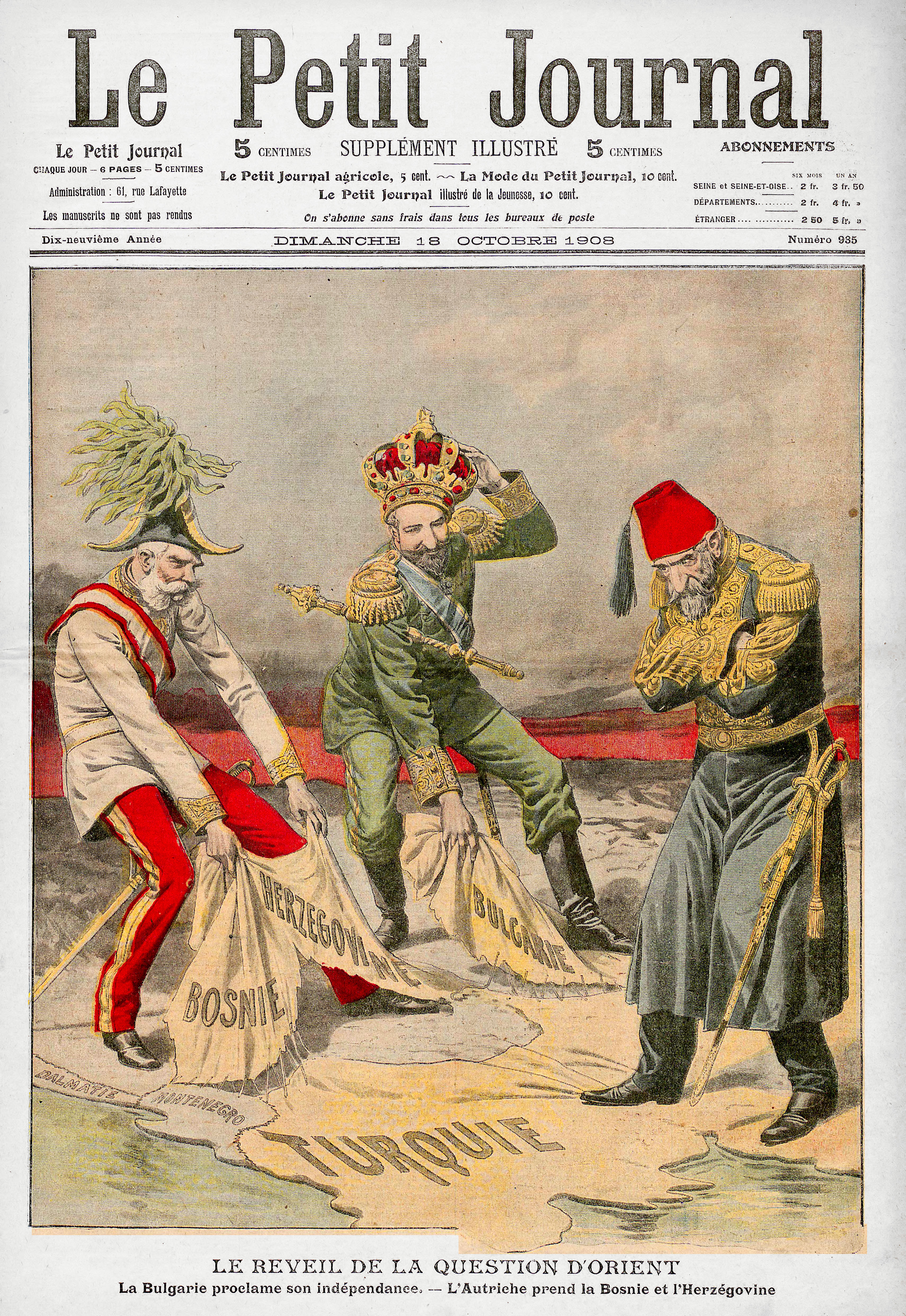1908–1909년 보스니아 위기는 오스트리아의 보스니아 헤르체고비나 합병 발표로 시작되었다.[250] 이 지역은 1878년 베를린 회의에서 오스트리아에 위임되었지만, 오스만 제국의 영토였다. 오스트리아의 조치는 불가리아의 독립 선언과 맞물려 열강, 특히 세르비아와 몬테네그로의 항의를 불러일으켰다. 1909년 베를린 조약 수정으로 위기는 종식되었지만, 오스트리아와 세르비아, 이탈리아, 러시아의 관계는 악화되었다. 러시아는 군비 증강을 서둘렀고, 세르비아 민족주의자들의 분노는 1914년 프란츠 페르디난트 암살로 이어졌다.[250]