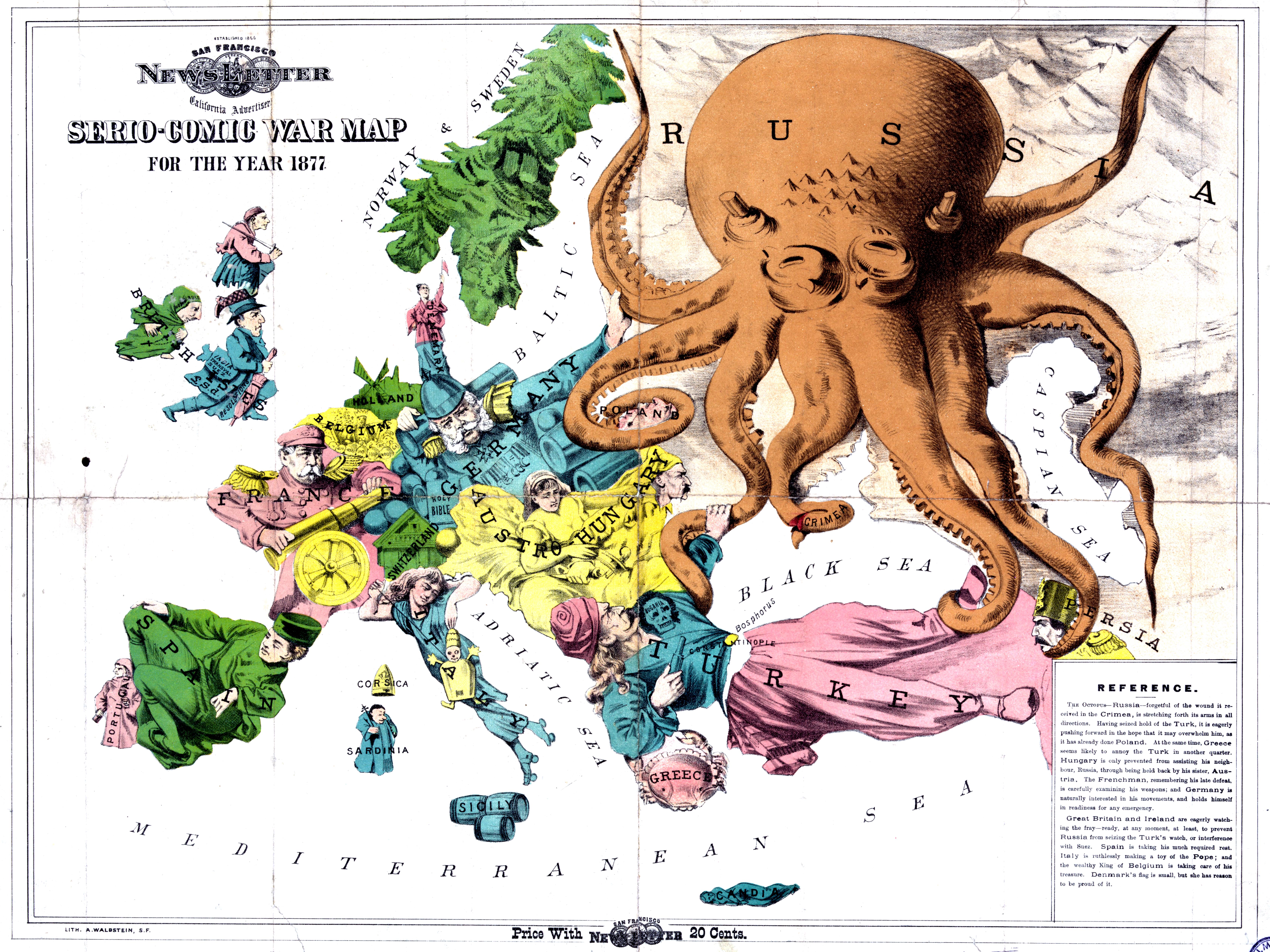 "러시아의 위협: 1877년의 진지하고 우스꽝스러운 전쟁 지도", 1877년 영국 만화로, 러시아를 오스만 제국을 특히 포함하여 인접한 땅을 집어삼키는 거대한 문어로 묘사